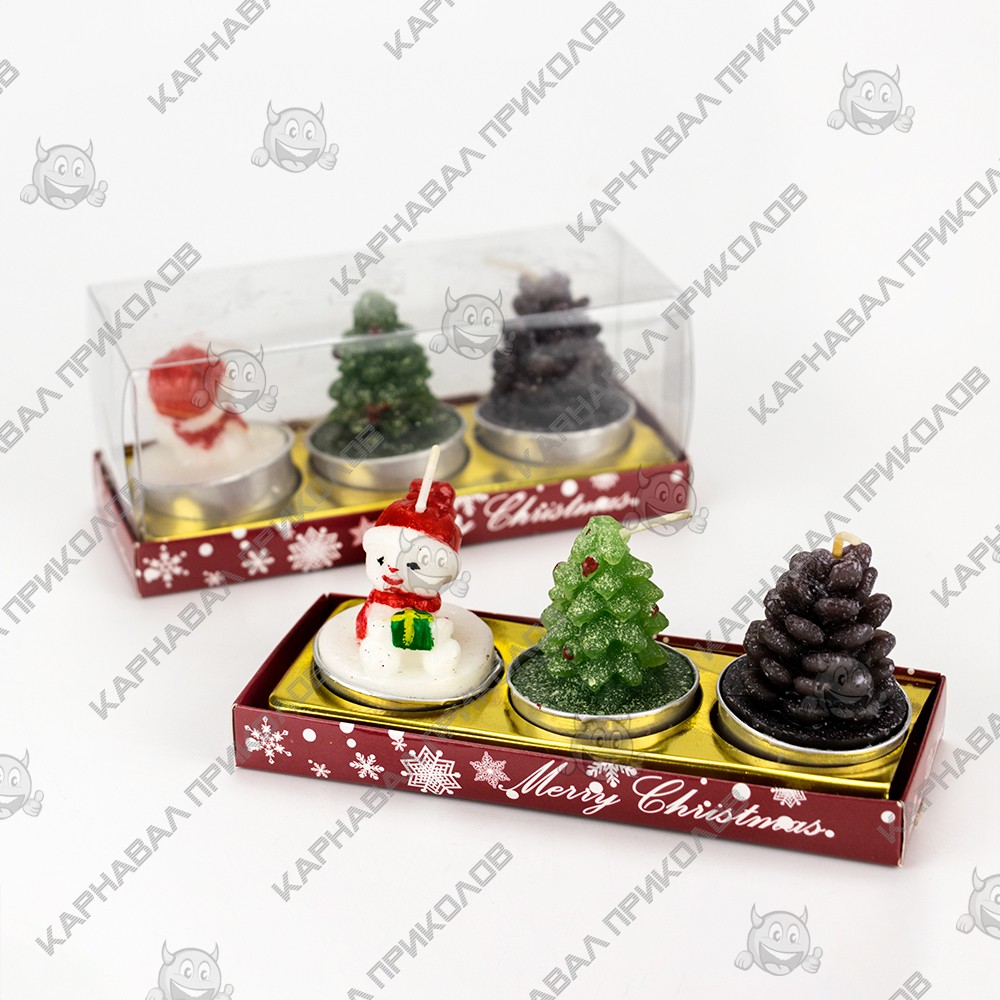 В комплекте свечи в форме: шишка, елка, снеговик