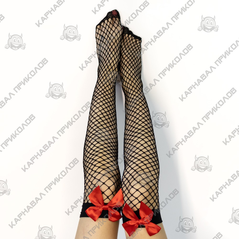 Чулки кружевные Сетка черные с красным бантом - поможет завершить свой мрачный образ на Хэллоуин. Нейлоновые чулки с изображением шнуровки с бантом идеально подходят для создания образа на тематический праздник День мертвых или Марди Гра. Чулки на резинке оптом и по дропшиппингу Вы можете купить в интернет магазине Карнавал Приколов.