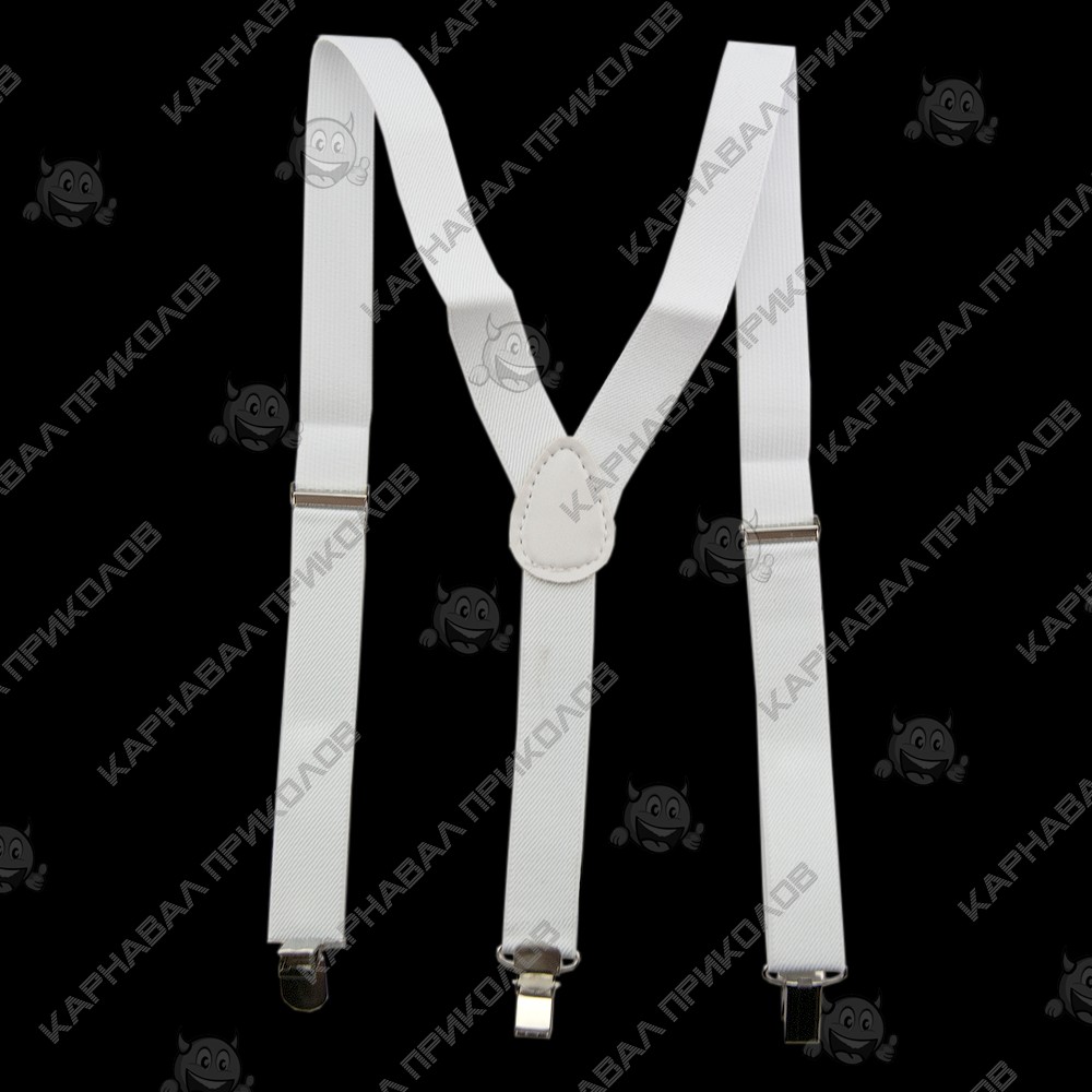 Подтяжки (белые) - эластичные подтяжки унисекс на застежке. Интернет магазин Карнавал Приколов предлагает Вам широкий выбор оригинальных подтяжек с принтом. Регулируемые подтяжки для брюк на резинке. Идеально подойдут в качествек повседневного аксессуара так и официального мероприятия. Удобные подтяжки ремешки с Y - образной спинкой. Легко фиксируются на штанах с помощью качественных металлических зажимов.