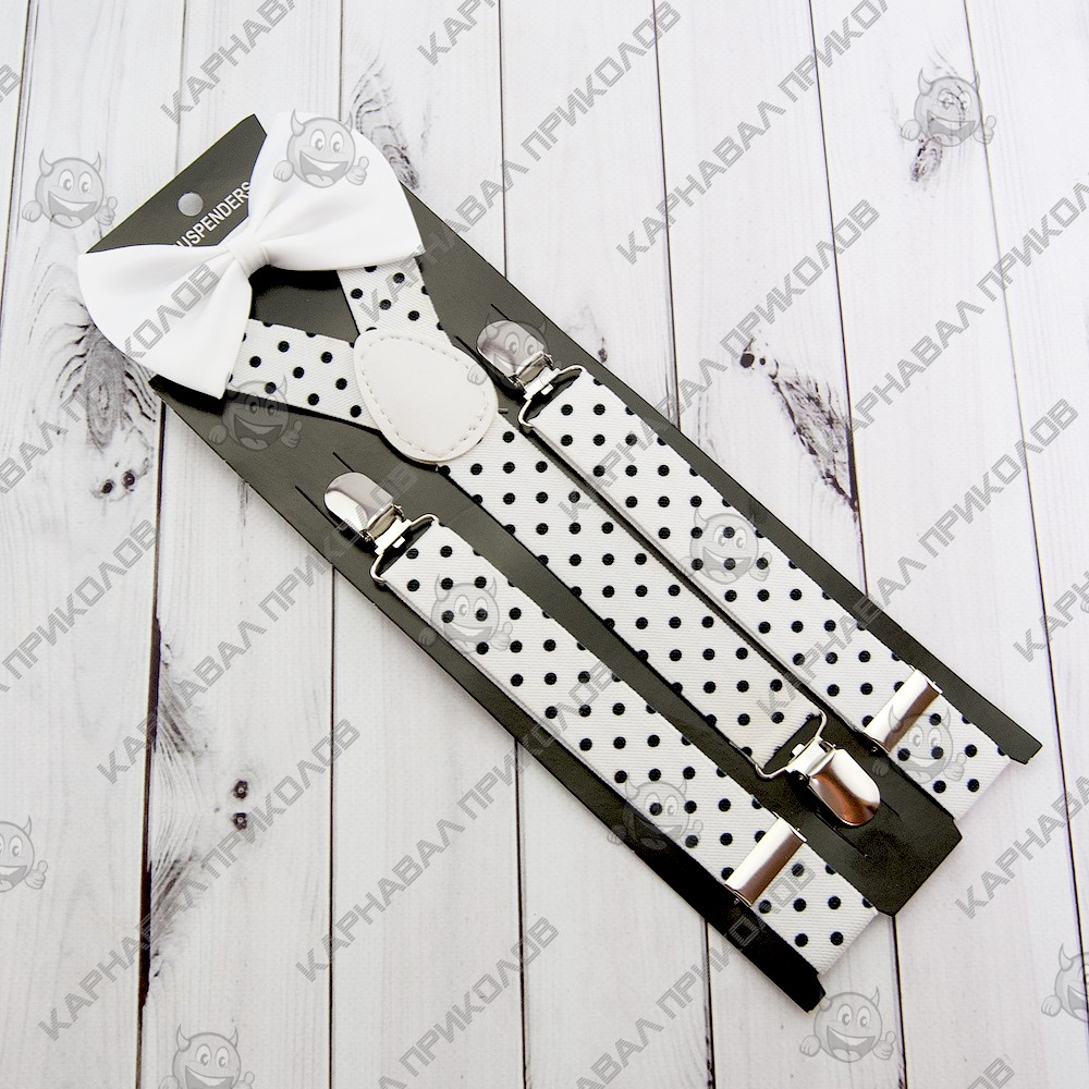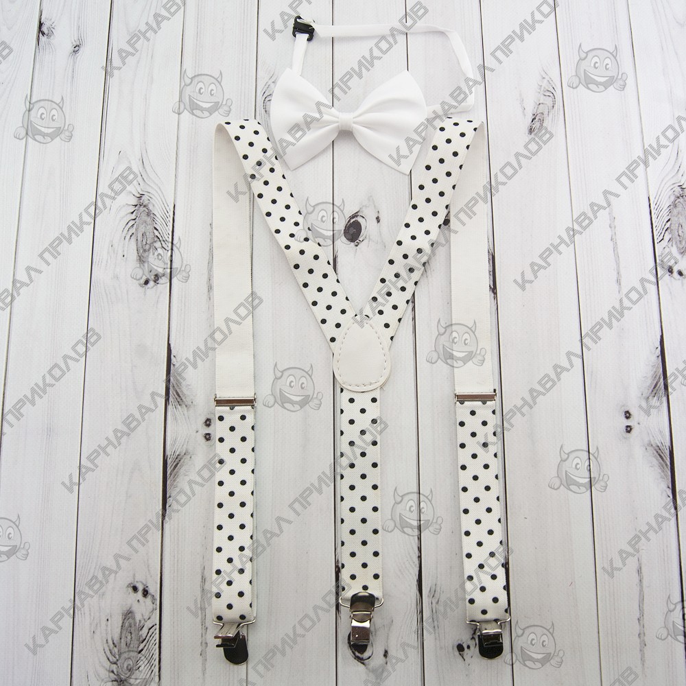 Подтяжки с галстуком бабочкой (белые) - эластичные подтяжки унисекс на застежке. Интернет магазин Карнавал Приколов предлагает Вам широкий выбор оригинальных подтяжек с принтом. Регулируемые подтяжки для брюк на резинке. Идеально подойдут в качествек повседневного аксессуара так и официального мероприятия. Удобные подтяжки ремешки с Y - образной спинкой. Легко фиксируются на штанах с помощью качественных металлических зажимов.