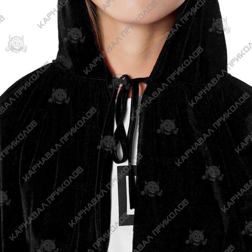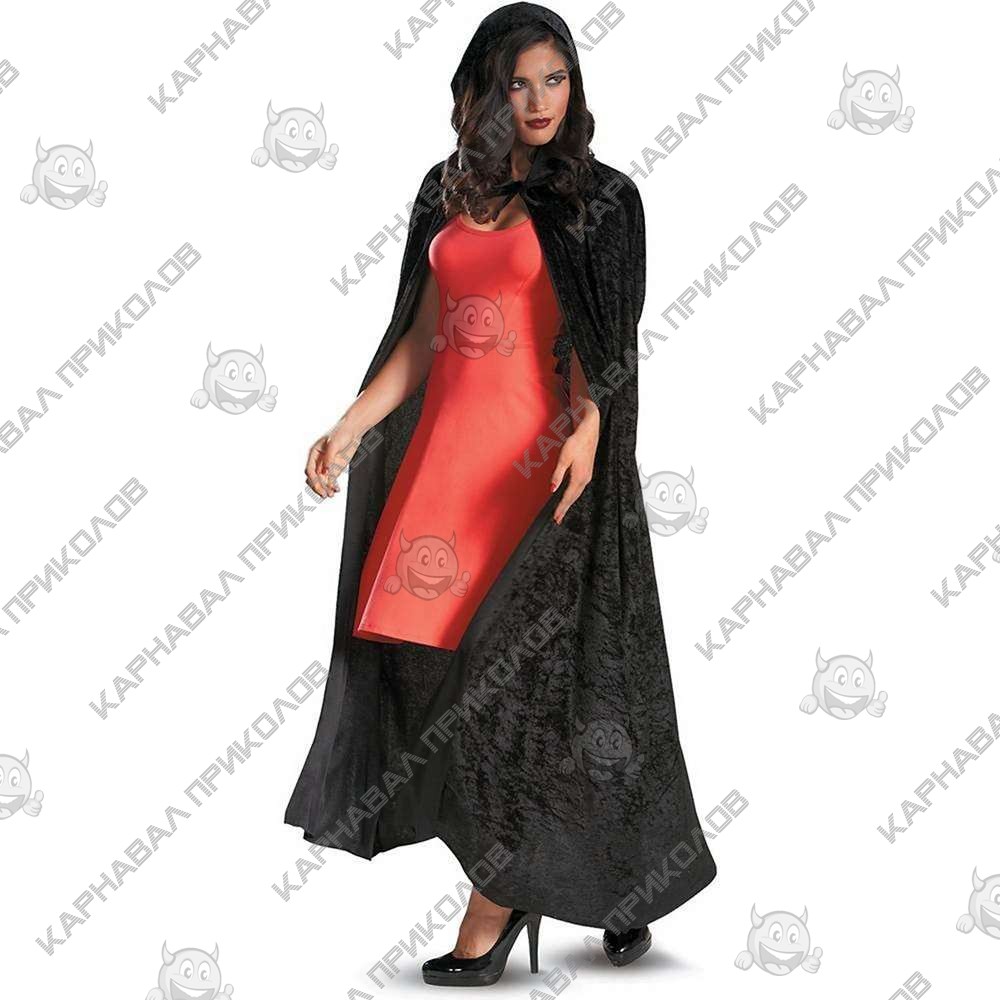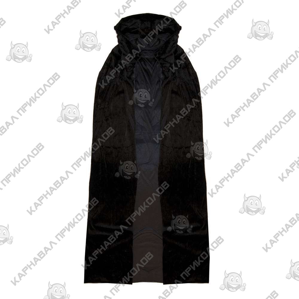 Карнавальный плащ черного цвета с капюшоном - дополнит образ вампира, роковой миледи на хэллоуин. Накидка длинною 120см (без капюшона) выполнена из насыщенного черного велюра с черными завязками. Купить карнавальный костюм для взрослых оптом и по дропшиппинг недорого в интернет магазине Карнавал Приколов. Только у нас самый большой выбор взрослых карнавальных костюмов по доступной цене.