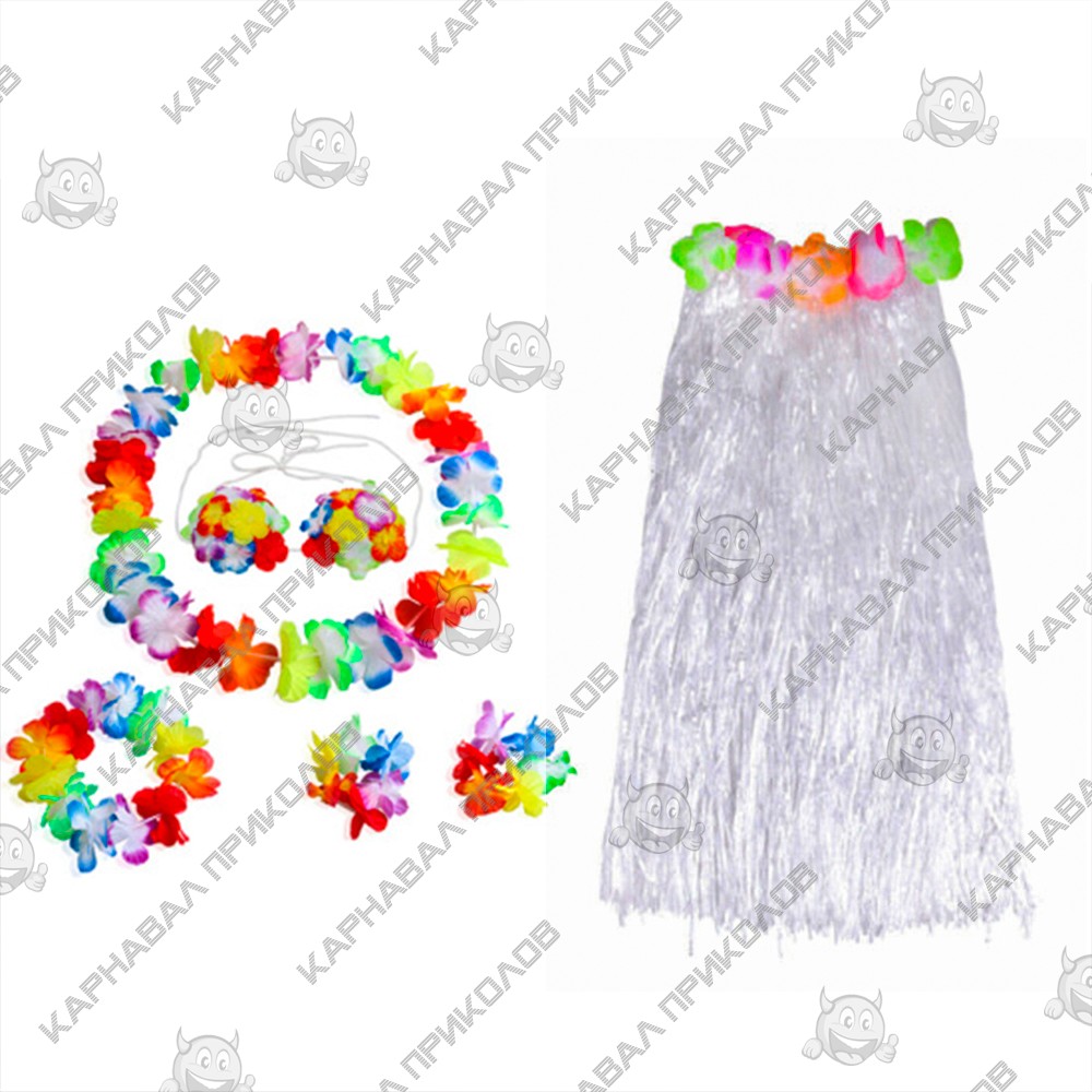 | Дополнительные характеристики: | юбка на резинке с липучкой длина: 75см, резинка на талии тянется от 60 до 100см, лиф пластиковый, чаша: 12х12х5см покрыта цветами, веночек на голову, лея на шею длиной: 50 см, браслет: 2 шт |