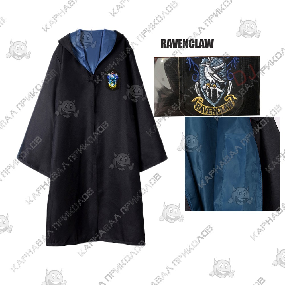 Почувствуй себя настоящим волшебником в мантии своего любимого факультета! Когтевран (англ. Ravenclaw) — один из факультетов Школы Чародейства и Волшебства Хогвартс, который основала Кандида Когтевран. Мантия Гарри Поттера для взрослых выполнена из габардина черного цвета с бордовой атласной подкладкой. Мантия Когтевран имеет глубокий капюшон, широкие рукава. На левой внешней стороне мантии волшебника на уровне сердца вышита эмблема герба Когтеврана, а на внутренней имеется карман для волшебной палочки. В английском оригинале факультет называется Ravenclaw, что переводится как коготь ворона (отсюда перевод Когте-вран). Популярная когтевранская пословица гласит wit beyond measure is man’s greatest treasure (Ума палата дороже злата, в оригинале: остроумие сверх меры является величайшим сокровищем человека). Форменная одежда из мира Гарри Поттера в Украине Оптом и по дропшиппинг. Плащ (Мантии) всех факультетов Хогвартс: Гриффиндор, Слизерин, Когтевран, Пуффендуй (из мира Гарри Поттера). Только у нас самый большой выбор взрослых карнавальных костюмов по доступной цене.