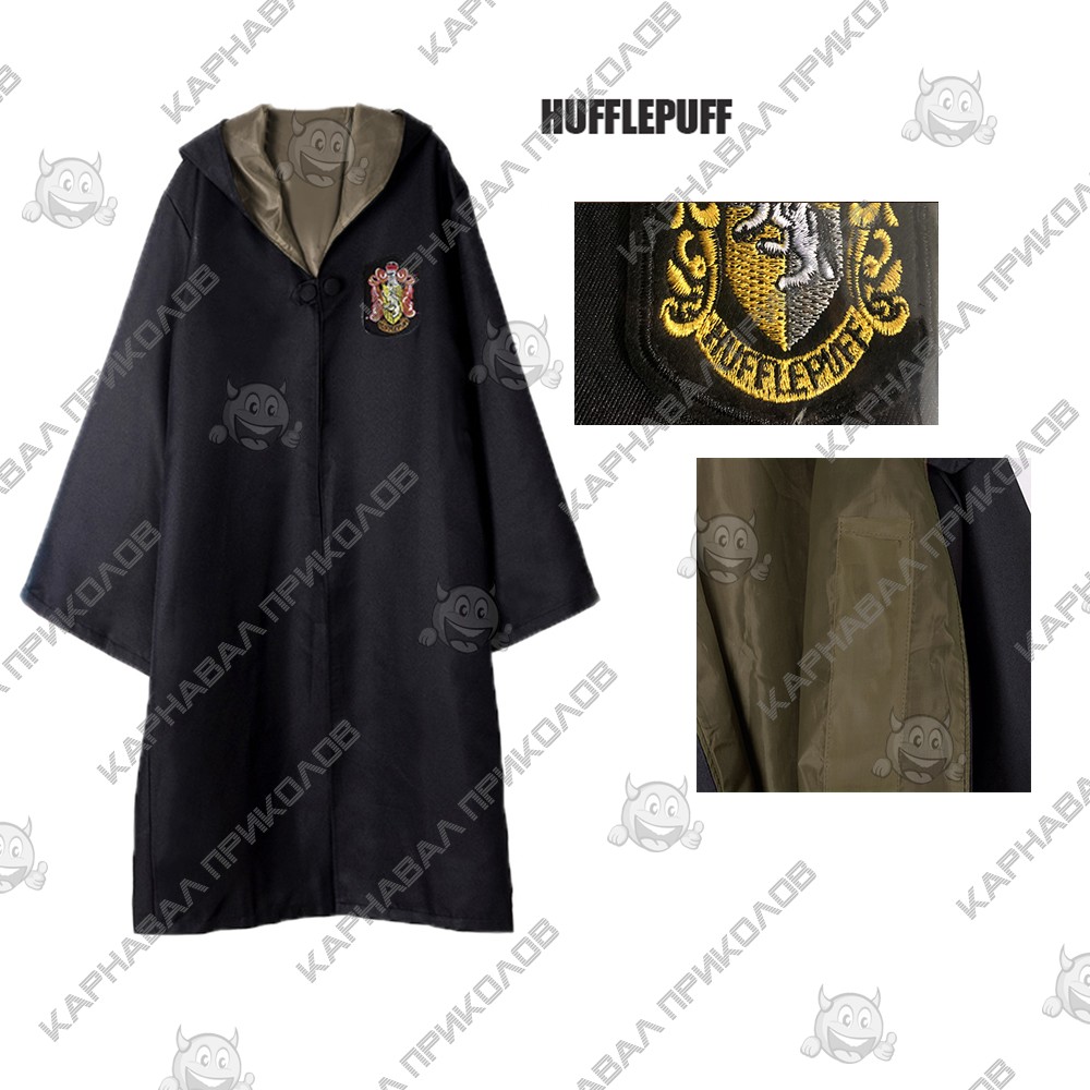Почувствуй себя настоящим волшебником в мантии своего любимого факультета! Пуффендуй (англ. Hufflepuff встречается перевод Хаффлпафф) — один из факультетов школы магии и колдовства Хогвартс. Мантия Гарри Поттера для взрослых выполнена из габардина черного цвета с бордовой атласной подкладкой. Мантия Пуффендуй имеет глубокий капюшон, широкие рукава. На левой внешней стороне мантии волшебника на уровне сердца вышита эмблема герба Пуффендуй, а на внутренней имеется карман для волшебной палочки. Прочтите название как Пуффендуй и вы представите, как это звучит по-английски. Отличительные качества учеников этого факультета: трудолюбие, терпение, верность, честность. Основатель: Пенелопа Пуффендуй. Форменная одежда из мира Гарри Поттера в Украине Оптом и по дропшиппинг. Плащ (Мантии) всех факультетов Хогвартс: Гриффиндор, Слизерин, Когтевран, Пуффендуй (из мира Гарри Поттера). Только у нас самый большой выбор взрослых карнавальных костюмов по доступной цене.
