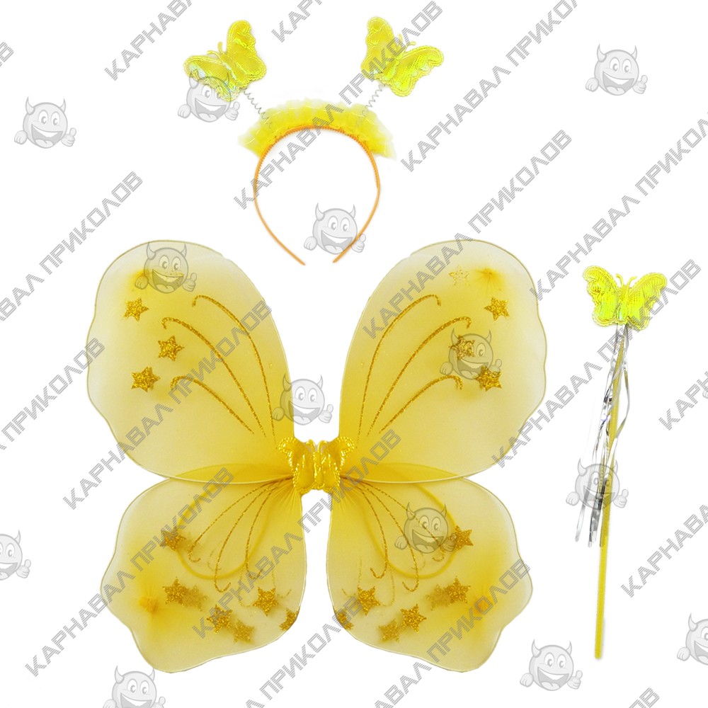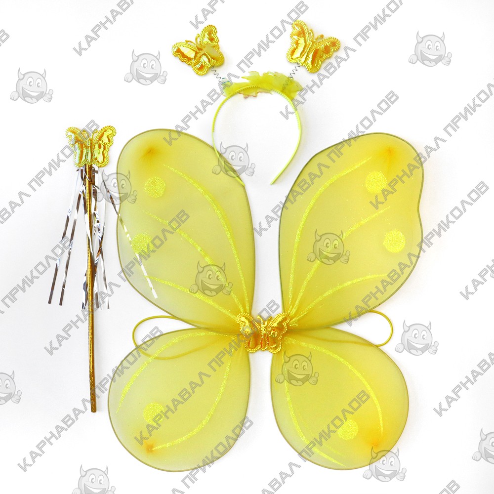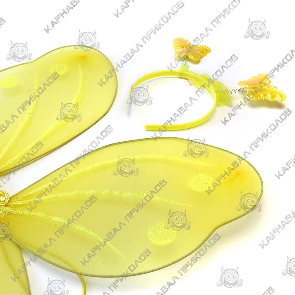 Интернет магазин Карнавал Приколов предлагает Вам купить детские карнавальные накладные Набор Бабочки 45х35см (желтый)оптом. Карнавальные радужные крылья Бабочки из капрона на металлическом каркасе. Основа крыльев - металлический каркас, обтянутый капроновой тканью. Надежно и практически крылья одеваются на плечи с помощью резинок. Крылья ангела прекрасно подойдут как для детского утренника, так и для маскарадного представления или концерта, фотосессии или свадьбы. В дополнение к карнаалавьному костюму можно купить волшебную палочку феи и ободок карнавальный Бабочка.