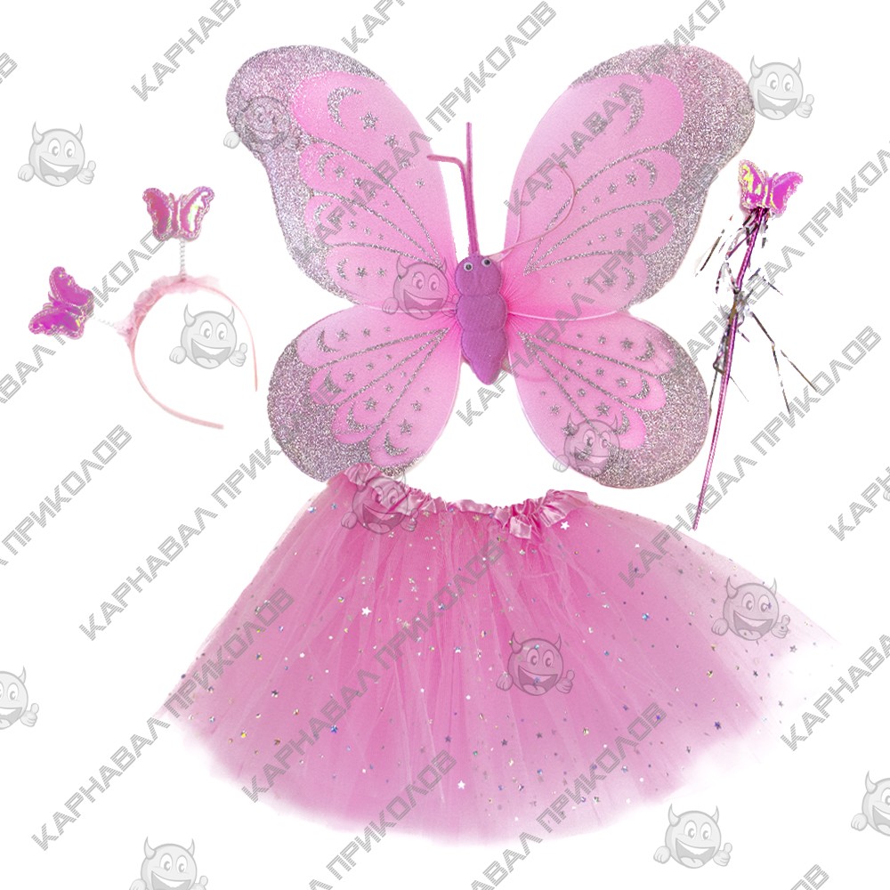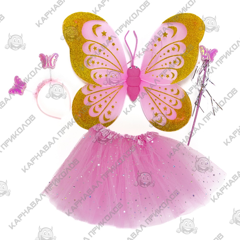 | Дополнительные характеристики: | Крылья - 50х38см, юбка из фатина: ширина в талии - 45 см, длина юбки - 30см, палочка:35х7х1см, ободок : 22х21х1,5см |
