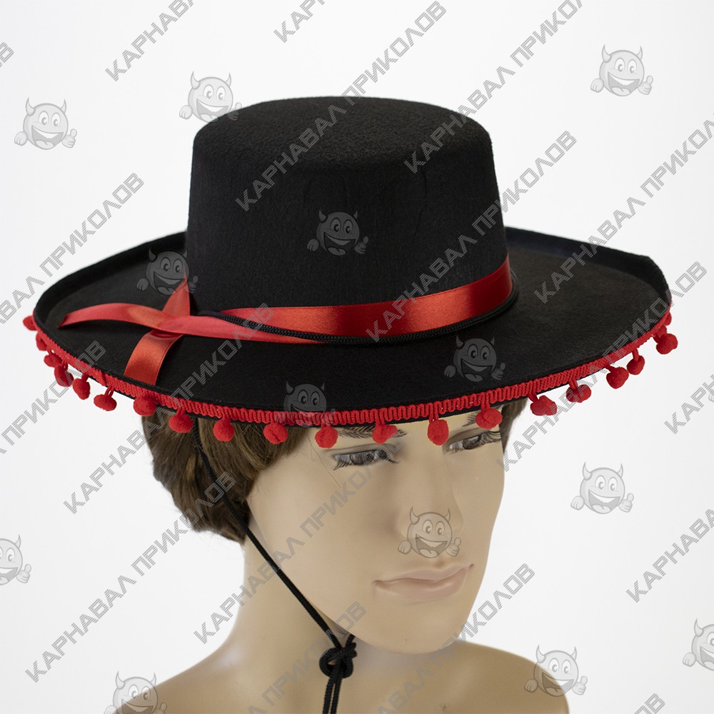 Шляпа Испанца (черная) – простой и незамысловатый способ создать карнавальный образ. Не важно, что вы оденете, на любой вечеринке, маскараде или карнавале вы в центре внимания. Шляпа Испанца (черная) изготовлена из фетра черного цвета и обрамлена красной атласной лентой и по краю полей красные бубончики. Купив Шляпу Испанца (черная) в интернет-магазине Карнавал Приколов Вы получаете не только качественный товар, но и 100 % позитивных впечатлений от приобретения. Среди нашего широкого ассортимента товаров, Вы найдете множество необычных и оригинальных подарков для различных мероприятий. Прикольные шляпы и карнавальные шапки принесут изюминку в образ вашего персонажа на тематической вечеринке, карнавале или маскараде. Многообразие форм, фасонов и моделей головных уборов, безусловно, облегчит Ваш поиск оригинального образа.