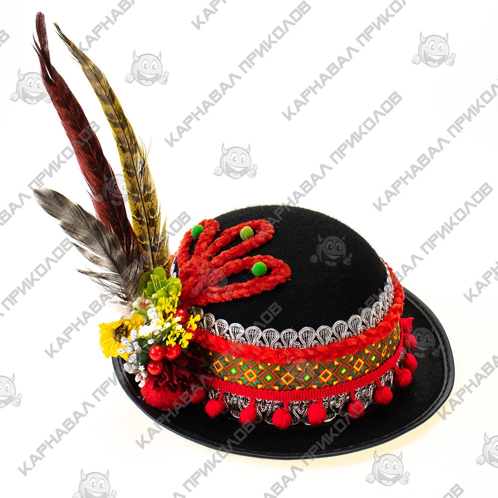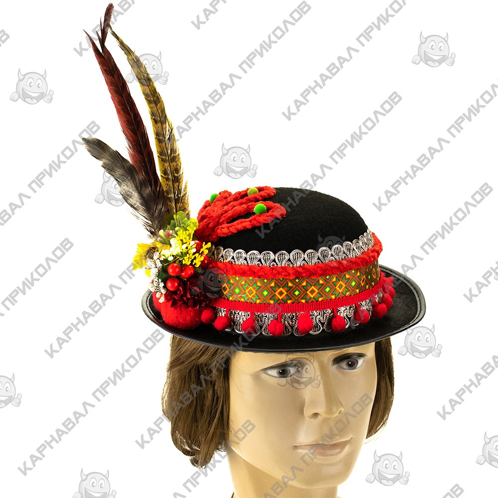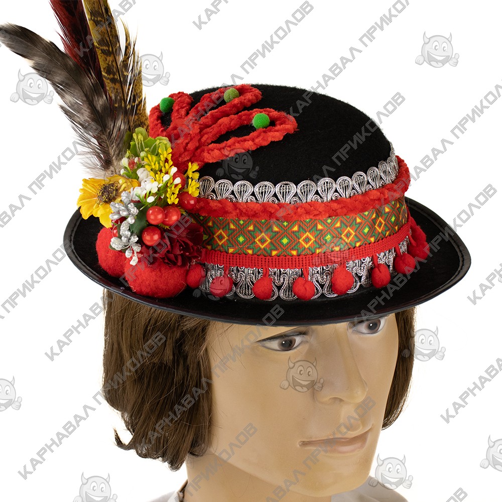 Шляпа Гуцульская ПОЛОНЫНА 13446 - это уникальный аксессуар, который отражает культурное наследие гуцульского региона и мастерство народных умельцев. Шляпа котелок черного цвета с полями украшена разнообразными декоративными элементами, придающими ей изысканность и колорит. Вдоль шляпы проходит лента с красными помпонами и сложная кружевная тесьма и яркая тканая лента с геометрическими национальными узорами. С одной стороны шляпа дополнена разноцветными перьями (желтые, красные и коричневые), небольшим букетом искусственных цветов, ягод и объемных помпонов. Эти элементы символизируют гостеприимство и традиции гуцульского народа, делая шляпу ярким акцентом любого наряда. Эта шляпа является частью украинского национального костюма для мужчин, олицетворяя богатое культурное наследие и традиции гуцульского региона. Национальная патриотическая символика в дизайне шляпы подчеркивает важность сохранения и уважения к украинским традициям. Шляпа Гуцульская ПОЛОНЫНА 13446 является эксклюзивным продуктом компании Карнавал Приколов и доступна для покупки как оптом, так и по дропшиппингу, что позволяет легко приобрести её в нужном количестве. Этот аксессуар идеально подходит для тех, кто ценит народное творчество и стремится сохранить традиции гуцульской культуры в современном гардеробе. Шляпа Гуцульская ПОЛОНИНА 13446 станет ярким дополнением к любому наряду и подчеркнет вашу любовь к этническим мотивам.