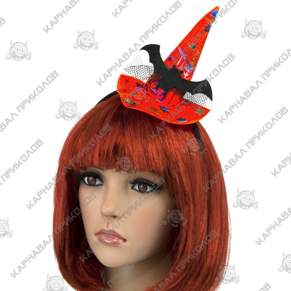 Шляпка на ободке Ведьмочки с принтом – очень стильный аксессуар на вечеринку в Хэллоуин. Одевается он на голову очень просто. Шляпка – очень стильный аксессуар на любой маскарад. Ободок обтянут тканью, шляпка выполнена также из ткани оранжевого, черного цветов и украшена летучей мышью. С таким набором вы будете выглядеть оригинально на карнавальном празднике, а праздник станет ярким!