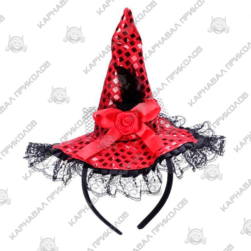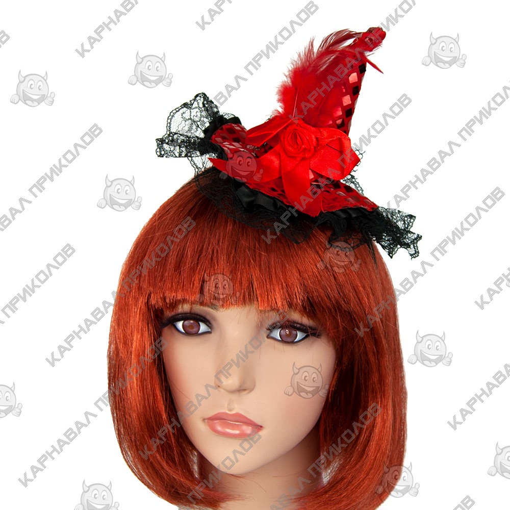 Шляпка на ободке Ведьмочки с кружевом - очень стильный аксессуар на вечеринку в Хэллоуин. Одевается он на голову очень просто. Шляпка - очень стильный аксессуар на любой маскарад. Ободок обтянут тканью, шляпка выполнена также из ткани красного, оранжевого, черного, розового, зеленого цветов и украшена пером. К ободку прилагается ленточка того же цвета, что и шляпка. С таким набором вы будете смотреться оригинально на карнавальном празднике, а праздник станет ярким и красочным!