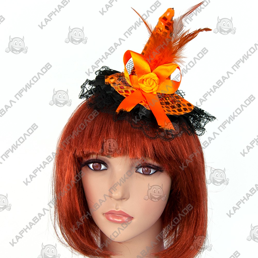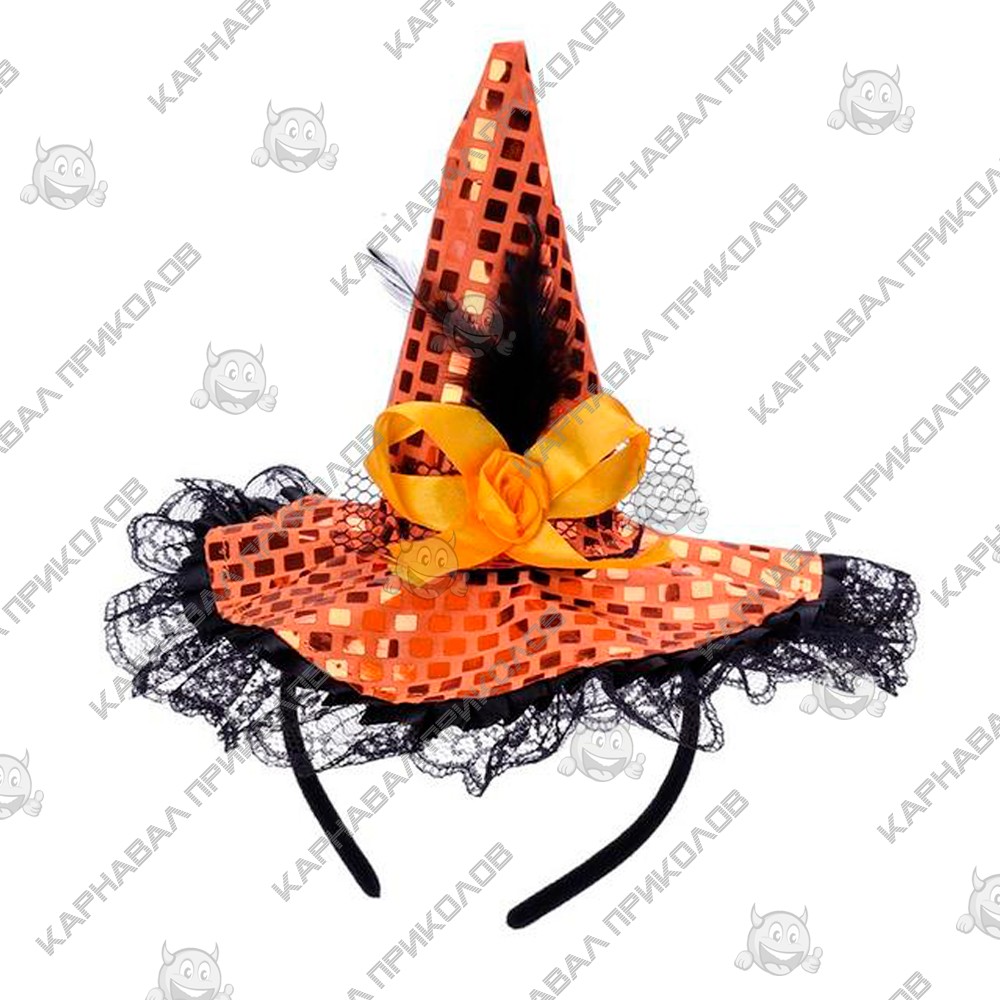 Шляпка на ободке Ведьмочки с кружевом - очень стильный аксессуар на вечеринку в Хэллоуин. Одевается он на голову очень просто. Шляпка - очень стильный аксессуар на любой маскарад. Ободок обтянут тканью, шляпка выполнена также из ткани красного, оранжевого, черного, розового, зеленого цветов и украшена пером. К ободку прилагается ленточка того же цвета, что и шляпка. С таким набором вы будете смотреться оригинально на карнавальном празднике, а праздник станет ярким и красочным!
