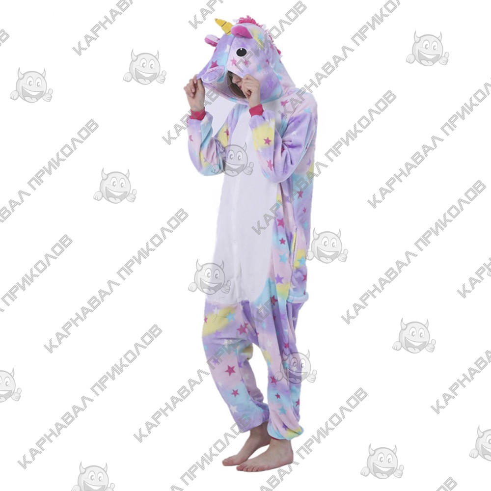 Кигуруми Единорог звездный XL — костюм, в котором любой обожающий эпатировать публику человек может изображать какого-нибудь персонажа мультфильма, кино или компьютерных игр. Кигуруми появились в Японии, стране, где сочетают традиционное качество и ультрамодные идеи. Сегодня кигуруми носят по всему миру, переодеваясь то в Пикачу, то в Стича, то в Майка Вазовски, Дракона или Хэлло Китти. Люди, которые их носят, называются кигуруминами. В общем, кигуруми — целая культура, которая уверенно завоевывает мир. А купить костюм кигуруми можно практически в любом городе, даже самом удаленном и малонаселенном. Комбинезон кигуруми — это не просто прикольный комбинезон, который может быть летним и зимним, с капюшоном, хвостиком и ушами. Это, прежде всего, удобный и клевый костюм, в котором тепло, легко двигаться и радовать окружающих. Мягкий, приятный на ощупь, выполненный из полиэстера, кигуруми не мнется и подходит как для парней, так и для девушек. Купить кигуруми можно себе самому или подарить друзьям — кигуруми создают для взрослых и детей, начиная с трех лет. Стирать костюм нужно вручную, а после стирки, не выжимая, тщательно просушить. При правильном ухаживании костюм подарит легкость движений и радостные эмоции. Кигуруми отлично подходят для проведения флешмобов, перформансов и концептуальных акций, веселых вечеринок и опен-эйров. Можно купить кигуруми костюм и использовать его во всемозможных целях. Кигуруми создают, опираясь на популярные во всем мире шедевры мультипликации, блокбастеры и самые крутые компьютерные игры. Любой персонаж игры или герой мультфильма неизменно популярен и любим детьми и взрослыми. Поэтому костюм, отсылающий нас к фантастической или забавной истории, обречен на то, чтобы привлекать внимание, поднимать настроение и заряжать позитивной энергией всех вокруг!