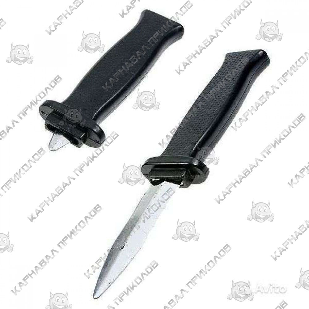 Нож бутафорский с убирающимся лезвием – классика жанра и забава для настоящих артистических личностей. Арсенал оригинальных подарков и прикольных розыгрышей интернет - магазина Карнавал Приколов - это постоянно обновляющаяся коллекция интересов, которые помогут вам вспахать над другом или даже показать удивительный фокус. Весь фокус ножа в том, что не острый меч легко прячется в рукоятке при нажатии на острие. В результате имеем иллюзию кровавого пронизывания плоти с виду острым лезвием. Фокус классический, а потому популярен в подростковой среде. Купить такой ножик с секретом можно школьнику – пусть разыграет учителя в случае неудовлетворительной отметки у дневника!
