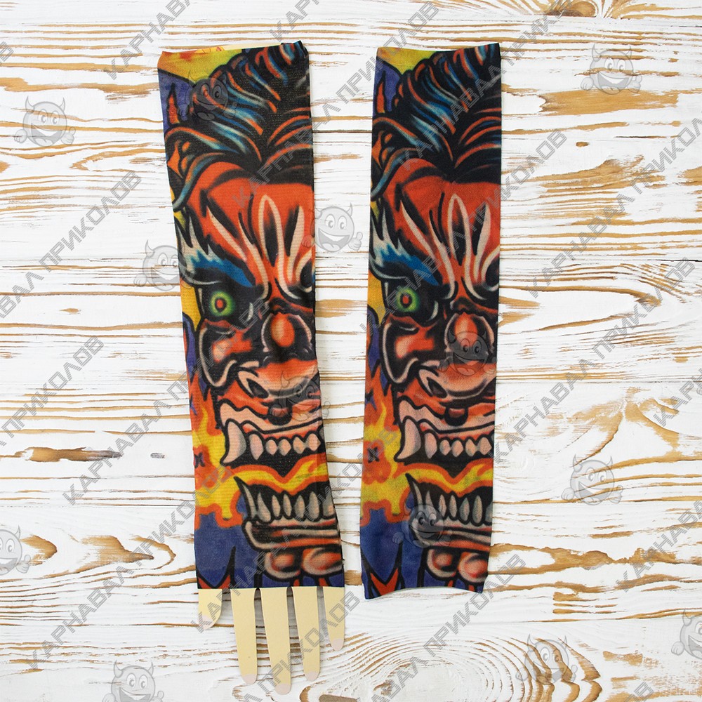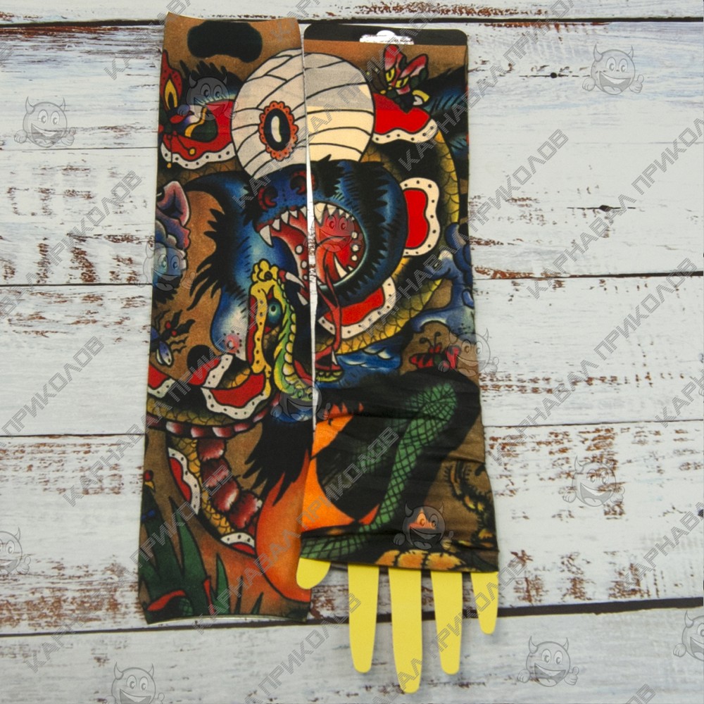 Вы мечтали о татуировке, но не могли решиться? Хотите расширить ассортимент Вашего магазина карнавальных аксессуаров? Тогда оптовый интернет магазин Карнавал Приколов предлагае купить бесшовные нейлоновые тату рукава с цветным рисунком. Тату рукава изготовлены из дышащего материала, по составу напоминающему капрон с пористой структурой, благодаря чему кожа под ними не потеет и не вызывают раздражений. Имеют универсальный размер. Одеваются тату рукава от запястья до плеча, поверх Вы можете одевать футболку или рубашку с кротким рукавом. Съемные тату рукава реалистично выглядят на руке, создавая впечатление эффектной татуировки. Рукава можно стирать.