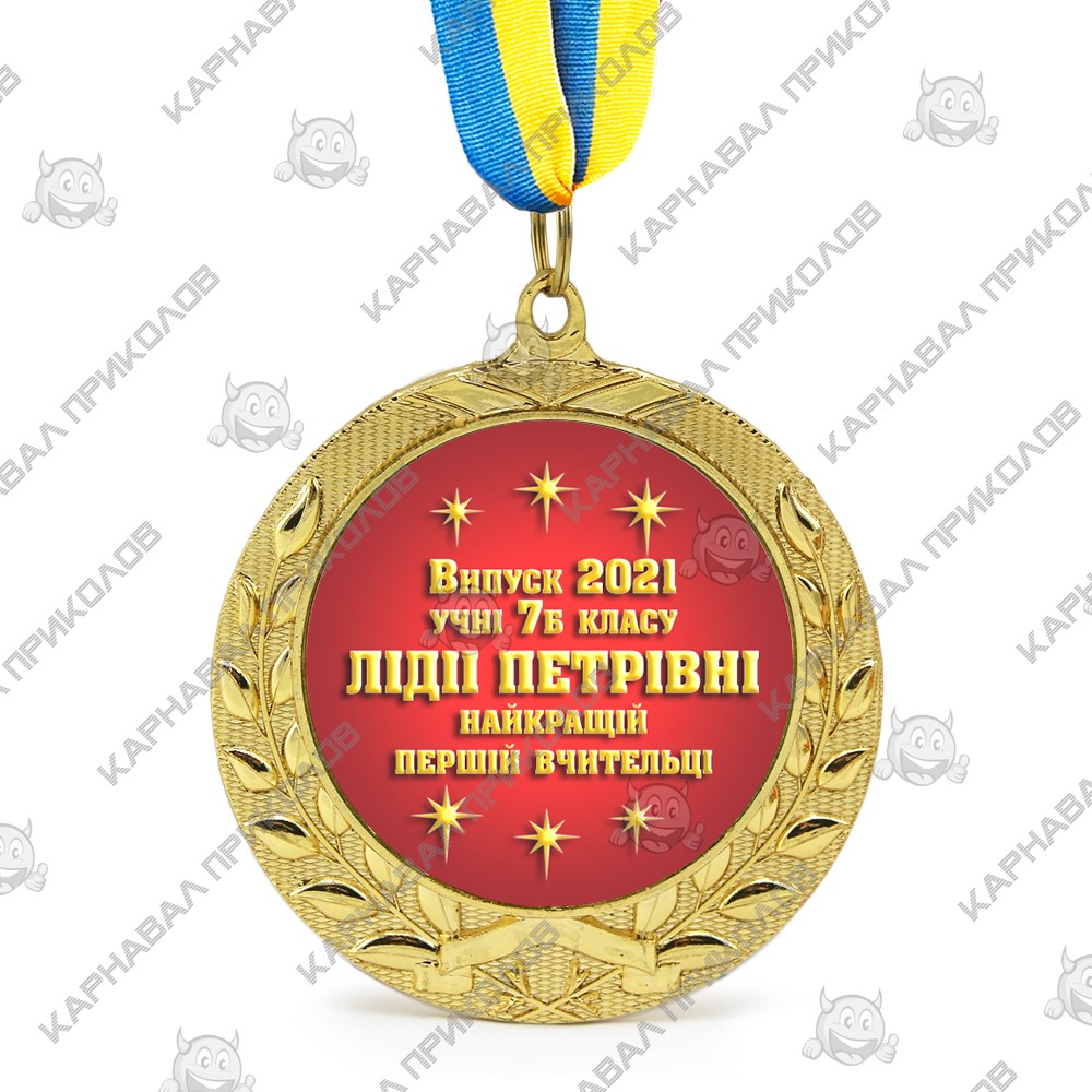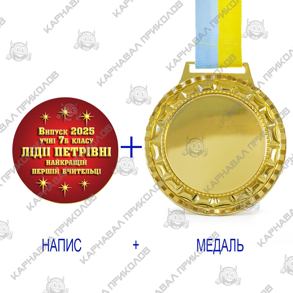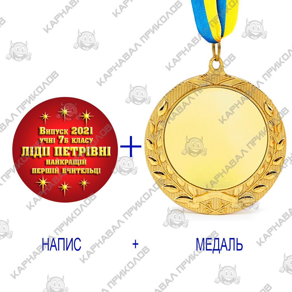 диаметр медали: 7см, диаметр жетона: 5см, длина ленты: 40см. Комплектация: жетон с индивидуальной надписью + медаль |