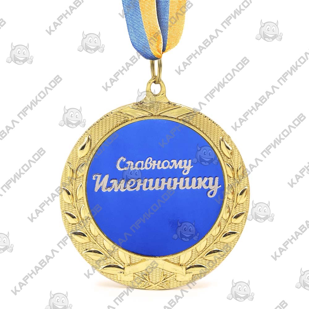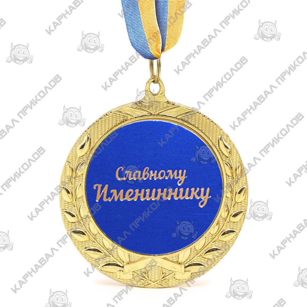 Что можно подарить на именины? Медаль Славному имениннику - прекрасный выбор, именно таким и должен быть подарок другу, приятелю или боссу в этот важный день - красивым и добрым. Награда синего цвета в золотой окантовке лавровых ветвей, на которой вытеснена золотыми буквами изящная надпись Славному имениннику. Медаль выполнена из сплавов различных металлов с покрытием благородного золотистого цвета нанесенного булатным способом, диаметром 7 см, размером жетона 5см и желто-голубой репсовой лентой длиною 40см. Медаль не подходит для выполнения на ней гравировки. Именины – один из любимых праздников, а необычные подарки сделают его ярким и запоминающимся. Заказывайте на нашем сайте сувениры, приколы и оригинальные подарки к этому празднику, для дорогих вам людей. Проверьте по календарю, возможно, их именины сегодня?