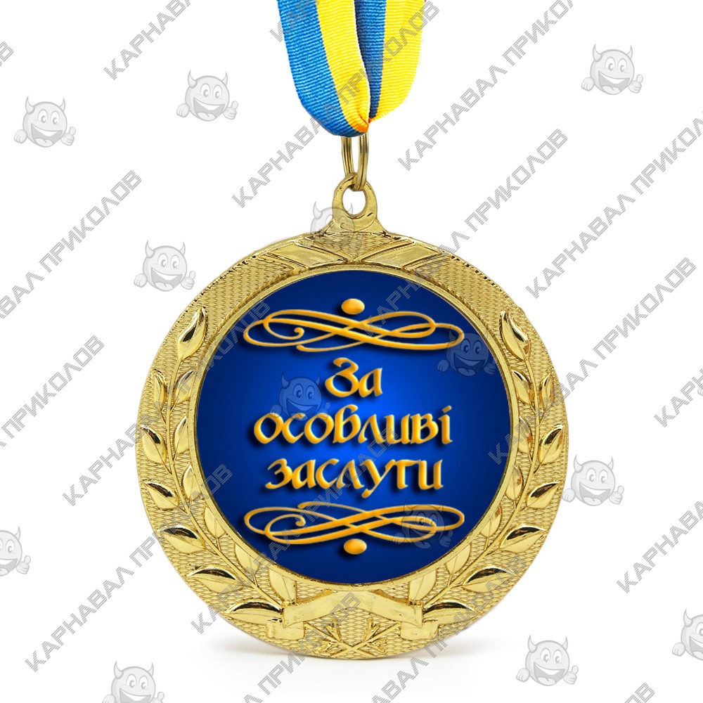 Медаль подарочная За особливі заслуги - отличная и оригинальная награда, ее можно вручить только тому человеку, который для Вас сделал доброе дело, совершившим благородный поступок. Подарок символичен и необычен, говорящий как дорог для Вас поздравляемый человек! Медаль подарочная 43262 За особливі заслуги в золотом обрамлении лавровых листьев - произведет впечатление и несомненно станет отличным подарком на память! Медаль выполнена из сплавов различных металлов с покрытием благородного золотистого цвета нанесенного булатным способом, диаметром 7 см, размером жетона 5см и желто-голубой репсовой лентой длиною 40см. Медаль не подходит для выполнения на ней гравировки. Среди нашего широкого ассортимента товаров, Вы найдете множество необычных и оригинальных подарков для различных мероприятий. Наш магазин предлагает товары оптом и для дропшипперов, вы можете оформить заказ на сайте Карнавал Приколов и задать любые интересующие вопросы менеджеру, заказав звонок на нашем сайте.