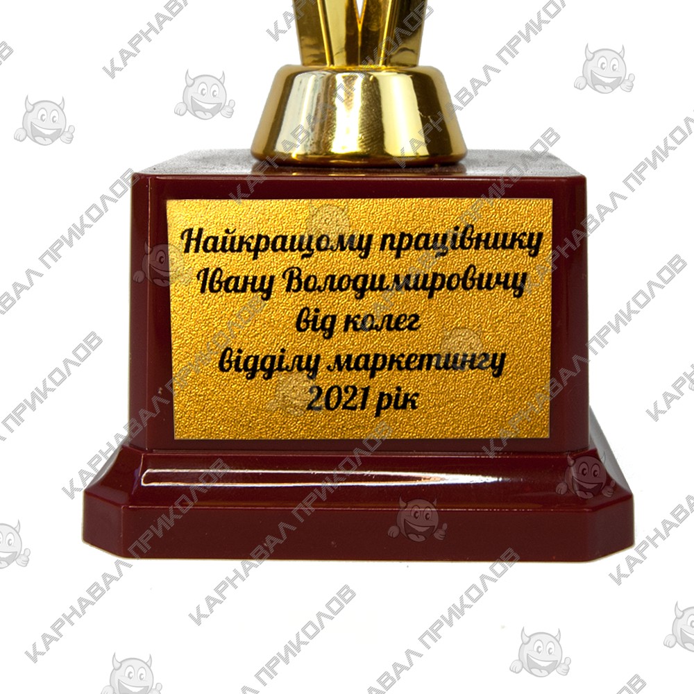 Интернет-магазин Карнавал Приколов представляет вашему вниманию услугу печати индивидуальной надписи на табличке для пьедестала Кубков и Статуэток размером 5. 2х3. 5см на пьедестале 6х6см. Услуга печати индивидуальной надписи на табличку для пьедестала Кубков и Статуэток производится на злотом фоне, цвет текста черный. Мы изготавливаем индивидуальную печать надписи на табличке пьедестала для Кубков и Статуэток шрифтом Lobster. Максимальное количество символов, которое можно разместить на табличке с учетом пробелов и знаков препинания 80. С учетом того, что максимально возможно разместить на такой табличке 5 строк. Гравировальных работ мы не производим. Отгрузка товаров с индивидуальной надписью производится на следующий рабочий день после подтверждения макета и оформления заказа. Огромнейший выбор кубков и статуэток – все ради Ваших предпочтений. Воспользуйтесь такой возможностью и закажите у нас услугу Табличка для кубков и статуэток. При выполнении используются пленка толщиной 1 мм и специальная клеевая основа с золотым напылением. У нас широкий ассортимент кубков для спортивных и танцевальных соревнований, выпускных вечеров, проведения церемоний награждения и корпоративных подарков. И это далеко не все, что мы можем для Вас изготовить. Остались вопросы? Задайте их менеджеру, заказав звонок на сайте.