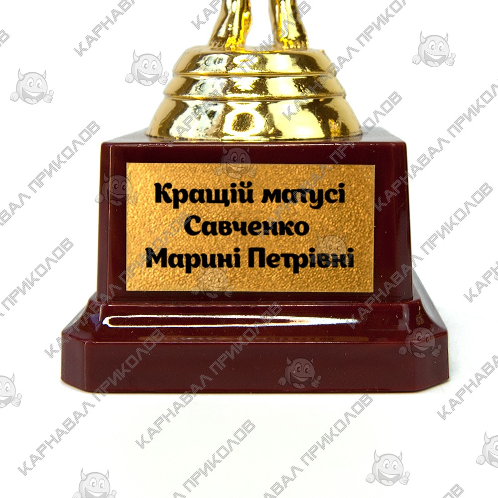 Интернет-магазин Карнавал Приколов представляет вашему вниманию услугу печати индивидуальной надписи на табличке для пьедестала Кубков и Статуэток размером 4. 2х2. 5см на пьедестале 5х5см. Услуга печати индивидуальной надписи на табличку для пьедестала Кубков и Статуэток производится на злотом фоне, цвет текста черный. Мы изготавливаем индивидуальную печать надписи на табличке пьедестала для Кубков и Статуэток шрифтом Appetite/ Максимальное количество символов, которое можно разместить на табличке с учетом пробелов и знаков препинания 40. С учетом того, что максимально возможно разместить на такой табличке 3 строки. Гравировальных работ мы не производим. Отгрузка товаров с индивидуальной надписью производится на следующий рабочий день после подтверждения макета и оформления заказа. Огромнейший выбор кубков и статуэток – все ради Ваших предпочтений. Воспользуйтесь такой возможностью и закажите у нас услугу Табличка для кубков и статуэток. При выполнении используются пленка толщиной 1 мм и специальная клеевая основа с золотым напылением. У нас широкий ассортимент кубков для спортивных и танцевальных соревнований, выпускных вечеров, проведения церемоний награждения и корпоративных подарков. И это далеко не все, что мы можем для Вас изготовить. Остались вопросы? Задайте их менеджеру, заказав звонок на сайте.