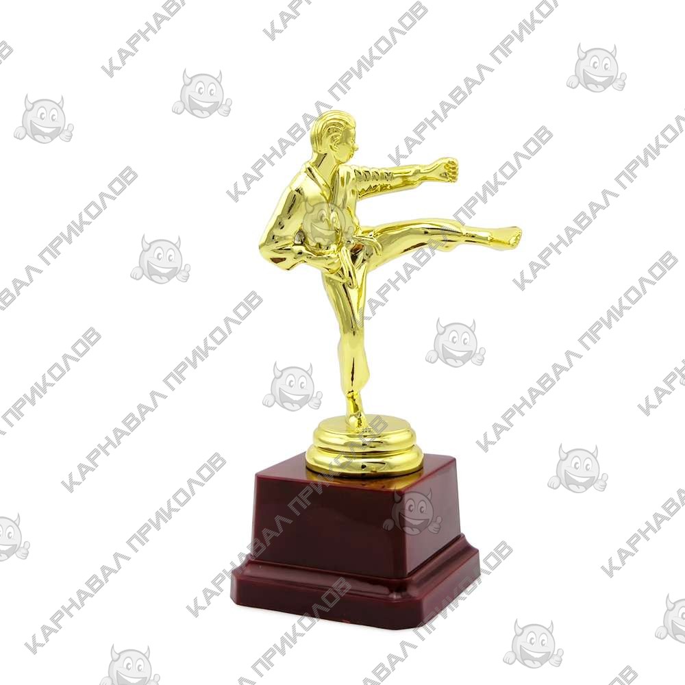 Статуэтка 57055 Каратист превосходный и оригинальный подарок. Подарочная статуэтка выполнена в виде человека в комоно в позе прийима из карате, из пластика с покрытием под золото на устойчивой подставке, такой сувенир станет отличным украшением интерьера и запоминающимся подарком.. Цвета фона: синий, красный, зеленый. Также изготавливаем индивидуальную печать надписи на табличке для пьедестала Кубков и Статуэток размерами: 4. 2х2. 5см (цвет текста - черный, фон - золотой). На бордовом пьедестале статуэтки может присутствовать имитация мраморных разводов. Наш магазин предлагает товары оптом и для дропшипперов, вы можете оформить заказ на сайте Карнавал Приколов и задать любые интересующие вопросы менеджеру, заказав звонок на нашем сайте.