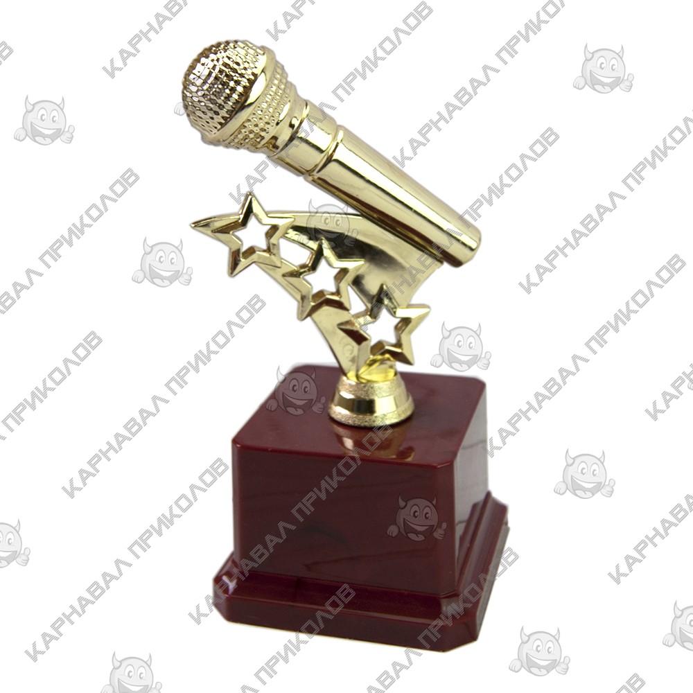 Статуэтка 57063 Золотой микрофон превосходный и оригинальный подарок. Подарочная статуэтка выполнена в виде микрофона на гребне звездной волны, из пластика с покрытием под золото на устойчивой подставке, такой сувенир станет отличным украшением интерьера и запоминающимся подарком. Также изготавливаем индивидуальную печать надписи на табличке для пьедестала Кубков и Статуэток размерами: 4. 2х2. 5см (цвет текста - черный, фон - золотой). На бордовом пьедестале статуэтки может присутствовать имитация мраморных разводов. Наш магазин предлагает товары оптом и для дропшипперов, вы можете оформить заказ на сайте Карнавал Приколов и задать любые интересующие вопросы менеджеру, заказав звонок на нашем сайте.