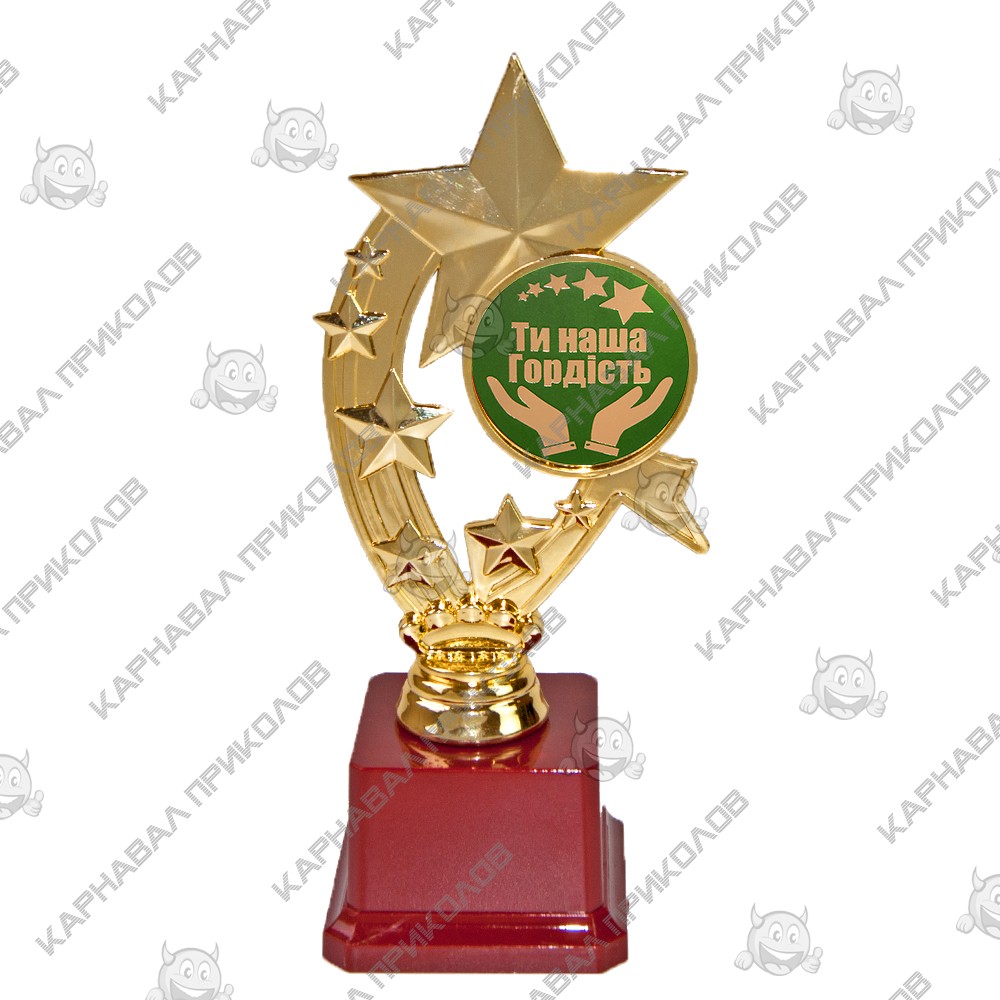 Статуэтка 57168T Ти наша гордість Звездное время - отличная универсальная и оригинальная награда, ее можно вручить коллеге или сотруднику, либо наградить отличившегося в коллективе. Хотите отметить окончание ВУЗа студента либо поздравить своего ребенка с окончанием школы? Статуэтка выполнена в виде 3D композиции звезд. Фигурка выполнена золотым цветом на классическом бордовом пьедестале. Статуэтка упаковывается в индивидуальный подарочный тубус из прозрачного пластика. Уникальная упаковка разработана компанией Карнавал Приколов. На бордовом пьедестале статуэтки может присутствовать имитация мраморных разводов. Оригинальные награды и призы в наличии и на заказ по низким ценам. Большой выбор кубков, медалей и наградных статуэток для любого повода в интернет магазине Карнавал Приколов.