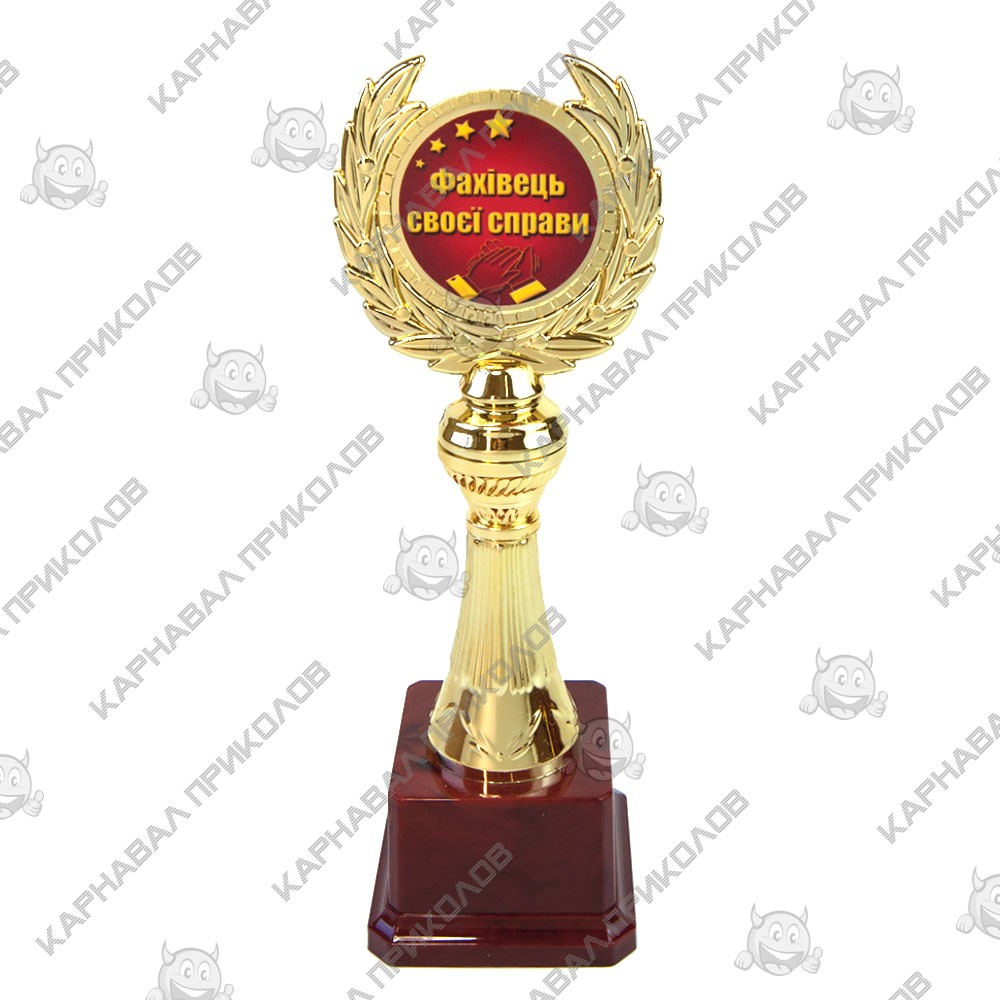 Статуэтка 57170 Фахівець своєї справи Лавровый венок укр – отличная универсальная и оригинальная награда специалисту, профессионалу и просто мастеру своего дела, ее можно вручить в знак признания заслуг. Статуэтка выполнена в виде 3D композиции стелы с лавровым венком. Фигурка выполнена золотым цветом на классическом бордовом пьедестале. Статуэтка упаковывается в индивидуальный подарочный тубус из прозрачного пластика. Уникальная упаковка разработана компанией Карнавал Приколов. Выполнение индивидуальных табличек для Кубков и Статуэток на пьедестал либо внутри жетона. На бордовом пьедестале статуэтки может присутствовать имитация мраморных разводов. Оригинальные награды и призы в наличии и на заказ по отличной цене. Большой выбор кубков, медалей и наградных статуэток для любого повода в интернет магазине Карнавал Приколов.