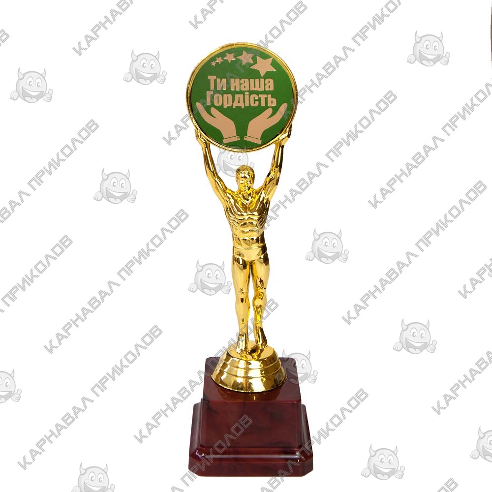 Статуэтка 57174Т Человек года Ти наша гордiсть - отличная универсальная и оригинальная награда, ее можно вручить коллеге или сотруднику, либо наградить отличившегося в коллективе. Хотите отметить окончание ВУЗа студента либо поздравить своего ребенка с окончанием школы? Необычный и очень символичный подарок, показывающий, насколько ценен для Вас поздравляемый человек! Статуэтка выполнена в виде 3D композиции Человека добившегося победы, мужественно поднявший медаль с надписью Ти наша гордість на украинском языке. Выполнена в благородном золоте на классическом бордовом пьедестале позволит наградить достойно, солидно, но в то же время оригинально! Кстати, по Вашему желанию можем изготовить любую индивидуальную надпись, нанеся её на пьедестал либо внутри медали. Статуэтка упаковывается в индивидуальный подарочный тубус из прозрачного пластика. Уникальная упаковка разработана компанией Карнавал Приколов. На бордовом пьедестале статуэтки может присутствовать имитация мраморных разводов. В интернет магазине Карнавал Приколов Вы можете купить оригинальные награды и призы в наличии и на заказ. Большой выбор кубков, медалей и наградных статуэток для любого повода.