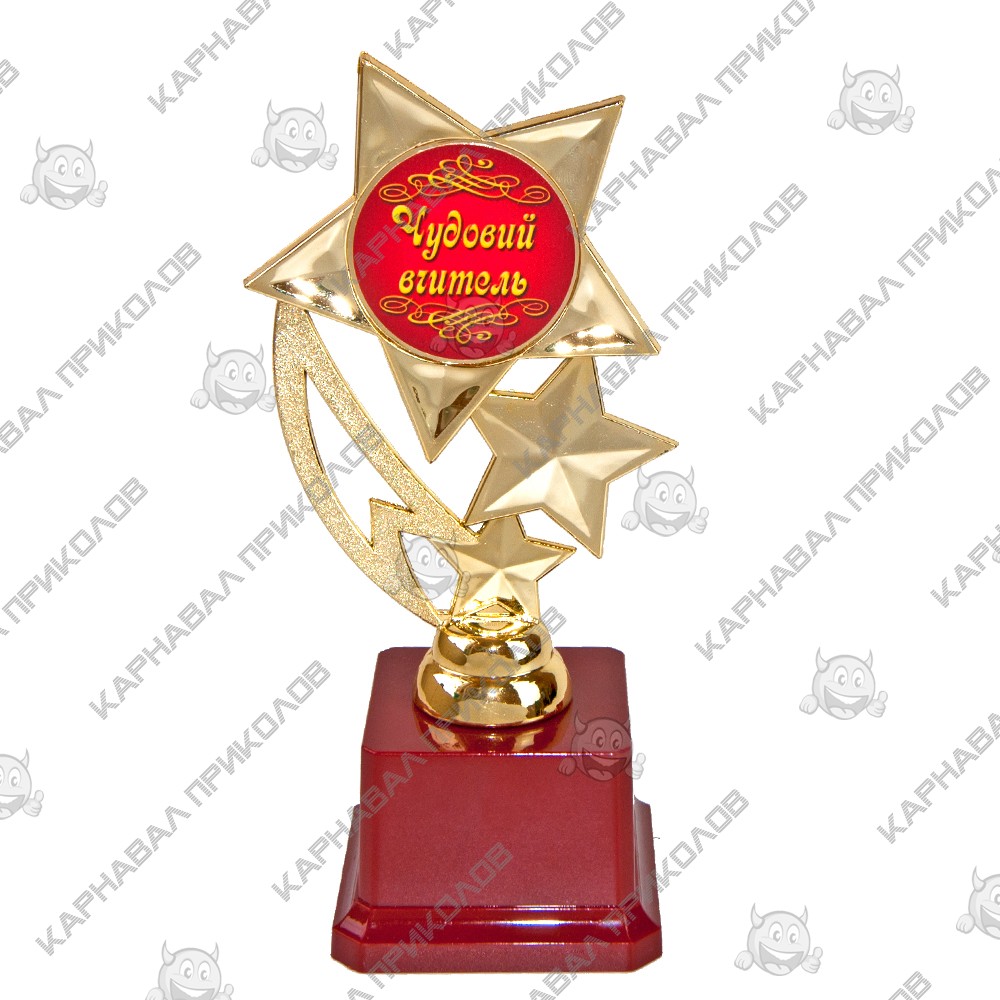 Статуэтка 570904 Чудовий вчитель Звездный полет - отличная и оригинальная награда, ее можно вручить и наградить учителя, подарить классному руководителю. Подарок символичен и необычен, говорящий как дорог для Вас поздравляемый человек! Статуэтка выполнена в виде 3D композиции звезд и медали, внутри которой надпись на украинском языке. Фигурка выполнена золотым цветом на классическом бордовом пьедестале. Статуэтка упаковывается в индивидуальный подарочный тубус из прозрачного пластика. Уникальная упаковка разработана компанией Карнавал Приколов. На бордовом пьедестале статуэтки может присутствовать имитация мраморных разводов. Оригинальные награды и призы в наличии и на заказ – отличная цена. Большой выбор кубков, медалей и наградных статуэток для любого повода в интернет магазине Карнавал Приколов.