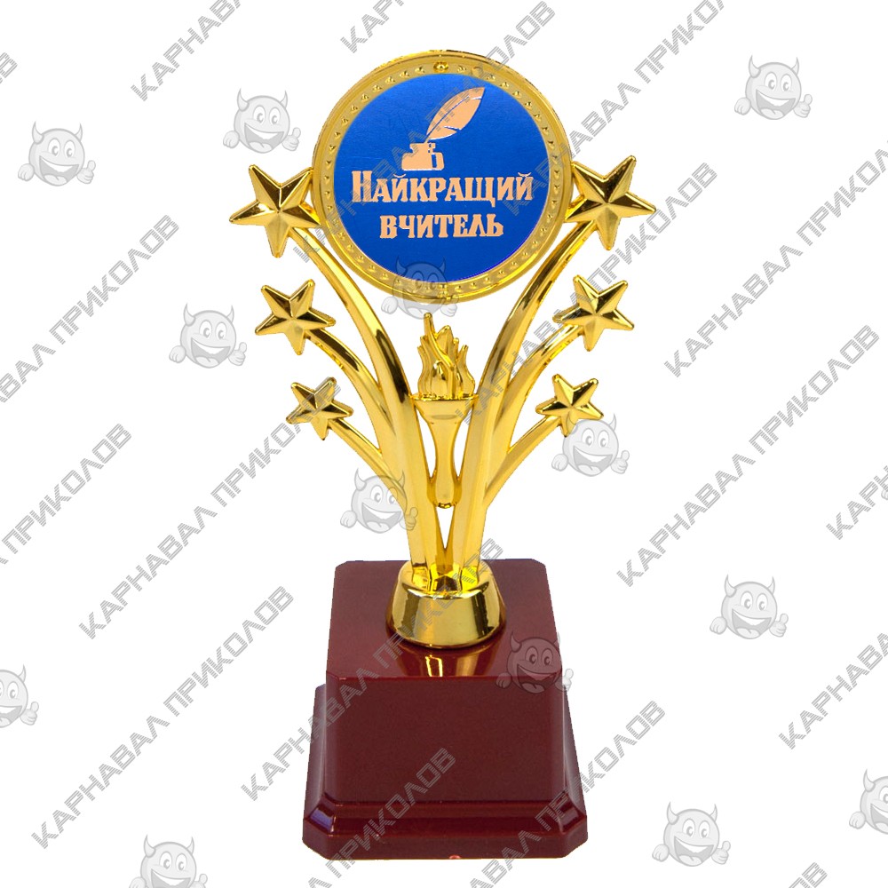 Статуэтка 570909Т Найкращий вчитель Звездный салют - отличная и оригинальная награда, ее можно вручить и наградить учителя, подарить классному руководителю. Подарок символичен и необычен, говорящий как дорог для Вас поздравляемый человек! Статуэтка выполнена в виде 3D композиции звезд и медали, внутри которой надпись на украинском языке. Фигурка выполнена золотым цветом на классическом бордовом пьедестале. Статуэтка упаковывается в индивидуальный подарочный тубус из прозрачного пластика. Уникальная упаковка разработана компанией Карнавал Приколов. На бордовом пьедестале статуэтки может присутствовать имитация мраморных разводов. Оригинальные награды и призы в наличии и на заказ – отличная цена. Большой выбор кубков, медалей и наградных статуэток для любого повода в интернет магазине Карнавал Приколов.