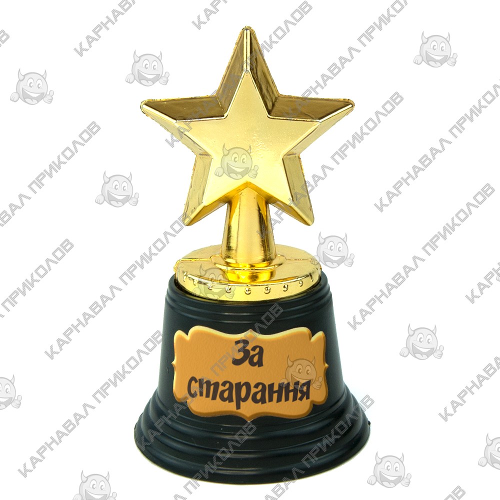 Статуэтка 570940 Звездочка За старання с надписью на украинском языке: За старання – идеальный сувенир для поощрения стараний ребенка, для учеников начальной школы или детского сада. Может выступать как полноценной наградой в номинации: За старание или быть утешительным призом. Статуэтка выполнена виде звезды из плотного пластика с покрытием под золото в и устойчивой подставкой, такой сувенир станет отличным украшением интерьера и запоминающимся подарком. На статуэтках Звездочка могут присутствовать производственные отверстия, возникающие в процессе формовки или литья. Отверстия малы и находятся в тех местах, где не влияют на общий вид изделия. Фото примера можно просмотреть в галерее. Статуэтка изготавливается под заказ. Обмену и возврату не подлежит. Наша компания предлагает большой выбор статуэток и к некоторым моделям возможно изготовление индивидуальной печати надписи на табличке для пьедестала Кубков и Статуэток (цвет текста - черный, фон – золотой) или на жетоне красного зеленого или синего цвета. Возможность изготовления индивидуальной печати необходимо дополнительно уточнять у менеджера. Наш магазин предлагает товары оптом и для дропшипперов.