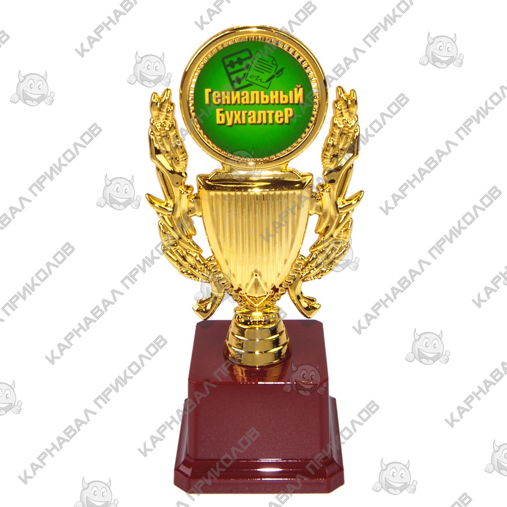 Статуэтка 57100 Гениальному бухгалтеру Кубок с венком - отличная и оригинальная награда, ее можно вручить юристу фирмы, адвокату, подарить мировому судье, либо студенту выпускнику юридического факультета. Подарок символичен и необычен, говорящий как дорог для Вас поздравляемый человек! Статуэтка выполнена в виде 3D композиции кубка с лавровым венком. Фигурка выполнена золотым цветом на классическом бордовом пьедестале. Статуэтка упаковывается в индивидуальный подарочный тубус из прозрачного пластика. Уникальная упаковка разработана компанией Карнавал Приколов. На бордовом пьедестале статуэтки может присутствовать имитация мраморных разводов. Оригинальные награды и призы в наличии и на заказ – отличная цена. Большой выбор кубков, медалей и наградных статуэток для любого повода в интернет магазине Карнавал Приколов.