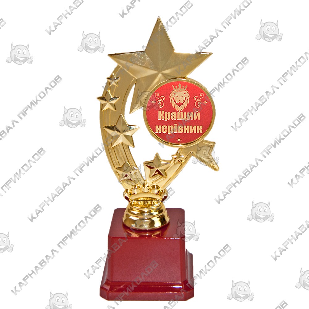 Статуэтка 57104 Кращий керівник Звездное время укр - отличная и оригинальная награда, ее можно вручить начальнику, руководителю, директору за заслуги в работе, показывающая насколько ценен для Вас поздравляемый человек! Статуэтка выполнена в виде 3D композиции звезд. Фигурка выполнена золотым цветом на классическом бордовом пьедестале. Статуэтка упаковывается в индивидуальный подарочный тубус из прозрачного пластика. Уникальная упаковка разработана компанией Карнавал Приколов. На бордовом пьедестале статуэтки может присутствовать имитация мраморных разводов. Оригинальные награды и призы в наличии и на заказ по отличной цене. Большой выбор кубков, медалей и наградных статуэток для любого повода в интернет магазине Карнавал Приколов.