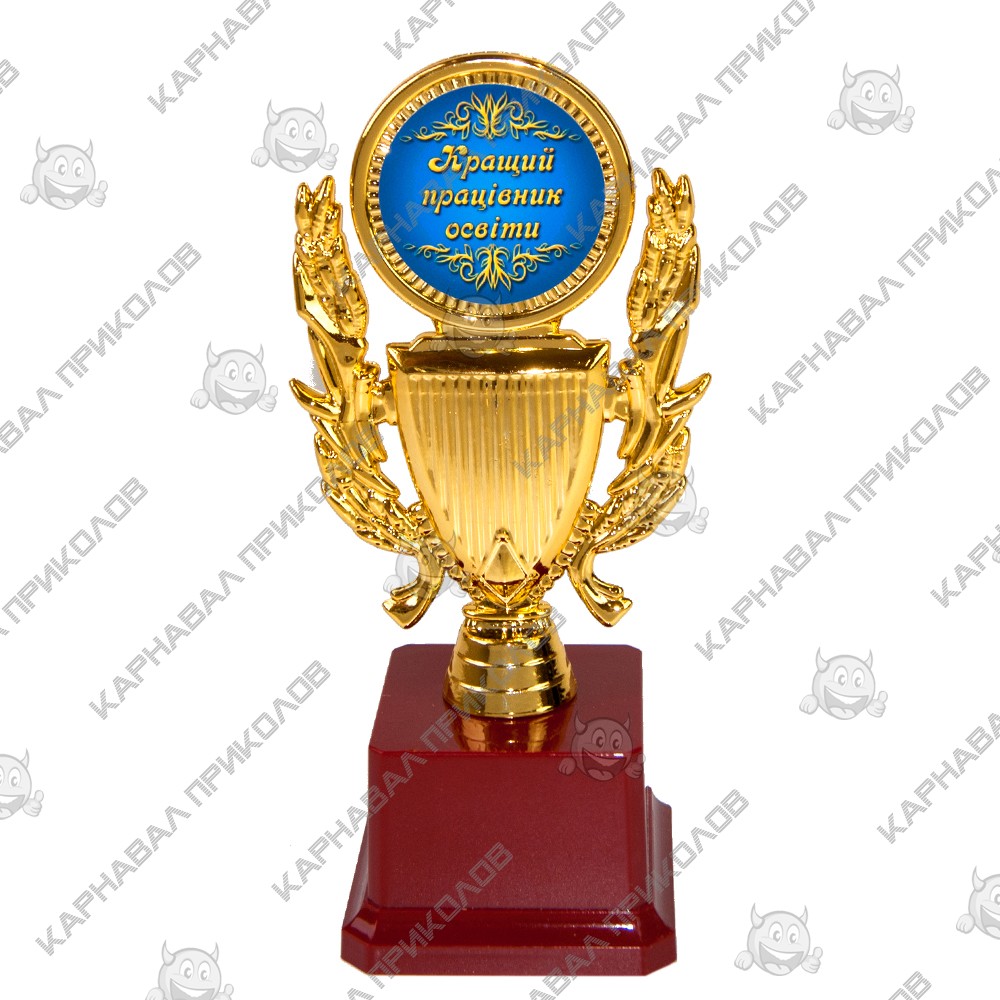 Статуэтка 570910 Кращий працівник освіти Кубок с венком - отличная и оригинальная награда, ее можно вручить директору школы, наградить учителя, подарить классному руководителю. Подарок символичен и необычен, говорящий как дорог для Вас поздравляемый человек! Статуэтка выполнена в виде 3D композиции кубка с лавровым венком, внутри которой надпись на украинском языке. Фигурка выполнена золотым цветом на классическом бордовом пьедестале. Статуэтка упаковывается в индивидуальный подарочный тубус из прозрачного пластика. Уникальная упаковка разработана компанией Карнавал Приколов. На бордовом пьедестале статуэтки может присутствовать имитация мраморных разводов. Оригинальные награды и призы в наличии и на заказ – отличная цена. Большой выбор кубков, медалей и наградных статуэток для любого повода в интернет магазине Карнавал Приколов.