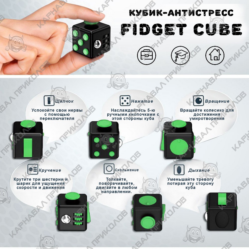 Кубик антистресс Fidget Cube (голубой c черным) - антистресс, обеспечивающий возможность сконцентрироваться на решении какой-либо задачи. Идея в том, чтобы дать владельцу игрушки возможность занять руки, пока он пытается сосредоточиться. Создатели утверждают, что Fidget cube сможет заменить пользователю любые ручки и карандаши, которые он привык вертеть в руках.