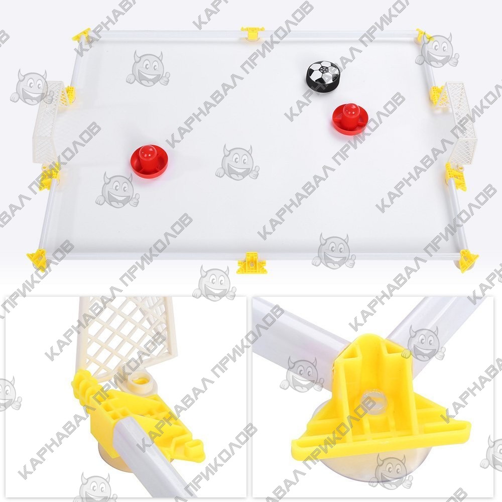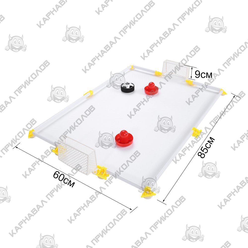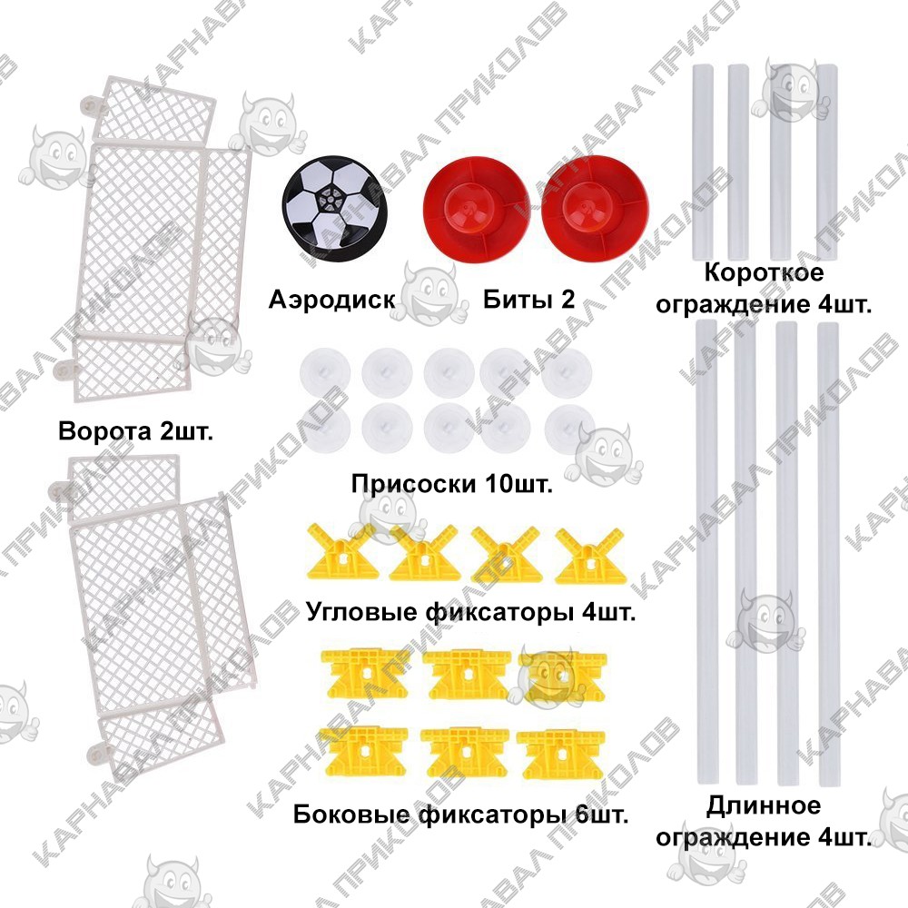 Комплектация: мяч – 1шт., клюшка- 2шт, ворота – 2 шт, ограда: длинные рейки (35см)- 4шт, короткие рейки (15см) -4шт, угловые крепежи – 4 шт, удлинители – 6 шт, присоски – 10 шт. |