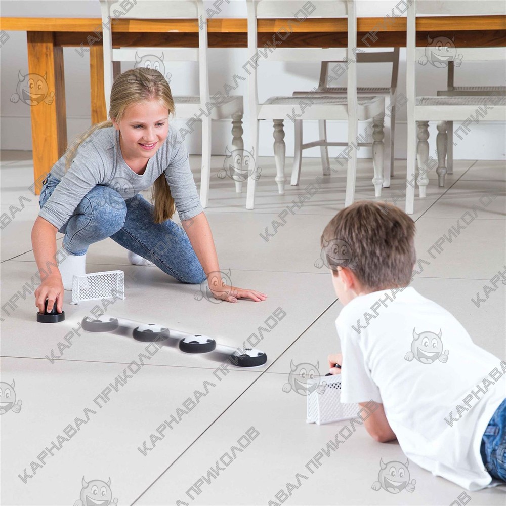 Играть дома мячом не самая хорошая затея, ведь очень легко запустить его в цветочный горшок, телевизор или окно. С летающим футбольным мячом HoverBall никаких незапланированных разрушений интерьера не случится. Мяч Hover Ball специально разработан для безопасной игры в помещении. Мощный вентилятор заставляет аэромяч парить по твердым поверхностям. По форме он представляет собой полусферу, которая двигается на воздушной подушке над поверхностью пола. Мягкий бампер по периметру игрушки защищает мебель и другие предметы от ударов. Летающий мяч Hover Ball был разработан специально для развлечения в помещении. Он оснащен толстым и мощным пенным бампером, который обеспечивает безопасность вашей мебели, стен и других ценностей. Он безобидно отскакивает от ножек стульев, стен и домашних животных, не оставляя царапин, сколов и отметок. Hover Ball оснащен LED-подсветкой, которая активируется при включении аэромяча и меняет несколько цветов по таймеру! Батареи у HoverBall расположены так, чтобы обеспечить равномерное распределение веса. Благодаря этому летающий мяч HoverBall и может парить в воздухе. Нижняя часть летающего мяча HoverBall закрыта защитной панелью. Открыв эту панель, вы увидите батарейный отсек. Hover Ball прекрасно работает на любых гладких поверхностях, включая ковры с небольшим ворсом, деревянные полы, линолеуму, ламинат, паркет и ковролин. Комплектация: мяч – 1шт., клюшка- 2шт, ворота – 2 шт, присоски – 4 шт. Текстильное поле с футбольной разметкой в комплектацию не входит. Работает от батарейки ААА (2 шт) в комплект не входят. Для того чтобы вставить или заменить батарейку, необходимо воспользоваться крестовой маленькой отверткой (в комплект отвертка не входит).