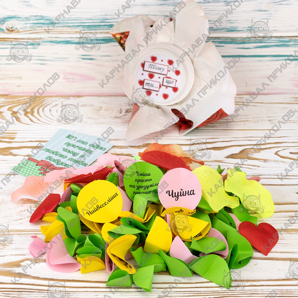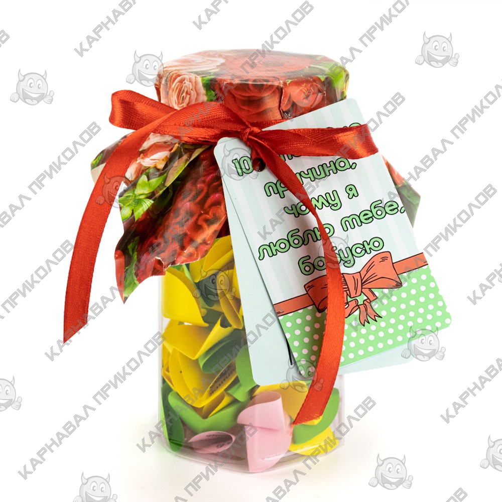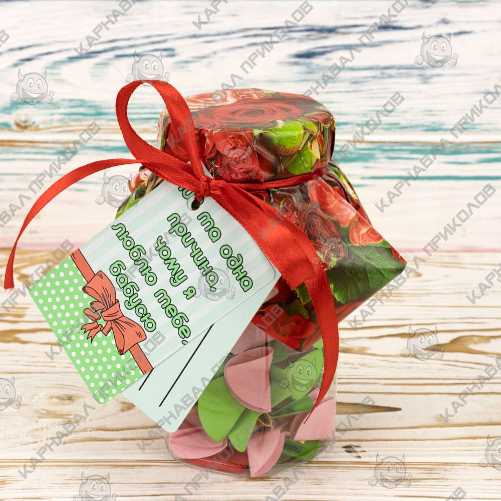 100 и Одна Причина, почему я люблю тебя, бабушка (укр.) — тщательно отобран нашими специалистами по ярким эмоциям. Баночка поможет Вам ежедневно радовать близкого Вам человека теплыми словами любви. Такой изумительный сюрприз можно подарить на день рождения либо преподнести на юбилей, или просто на 8 марта. Разворачивая фантики, произносите Ты желаешь мне счастья, Подарок выполнен на украинском языке. Ты умеешь интересно шутить, У тебя золотое сердце… Разумеется, Вы можете постараться сделать такую банку своими руками, но это заберет у Вас невероятно много времени. Чтобы Вы не сидели несколько часов, вырезая фантики и придумывая, что же написать, мы сделали все за вас. Вы можете купить уже готовую увлекательную игру в подарок родным и близким, друзьям и знакомым. Интернет магазин Карнавал Приколов предлагает купить оптом интересные и оригинальные подарки по низким ценам, а также Вы можете оформить заказ на сайте и задать любые интересующие вопросы менеджеру, заказав звонок на нашем сайте.