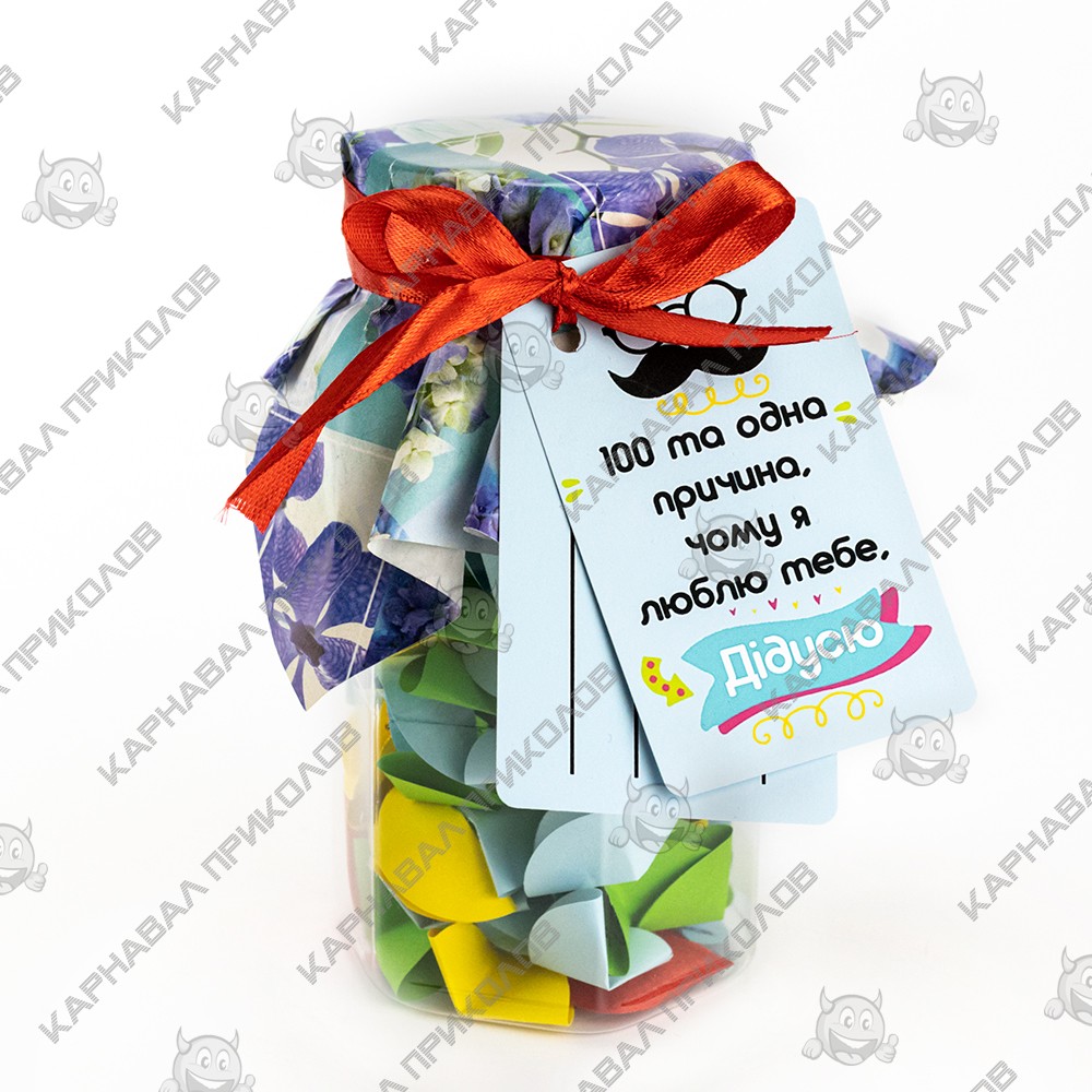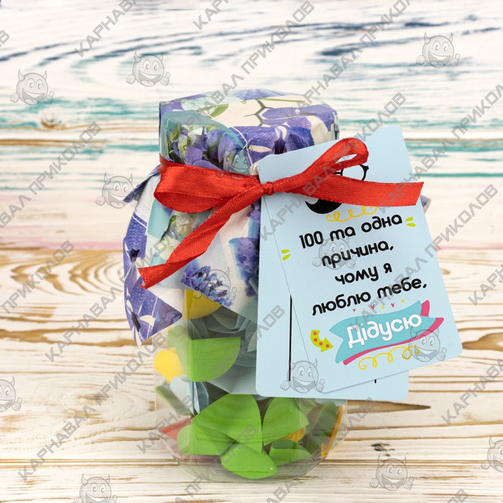 100 и Одна Причина, почему я люблю тебя, дедушка (укр.) — тщательно отобран нашими специалистами по ярким эмоциям. Баночка поможет Вам ежедневно радовать близкого Вам человека теплыми словами любви. Такой изумительный сюрприз можно подарить на день рождения либо преподнести на юбилей. Разворачивая фантики, произносите Ты заботливый, Ты справедливый, Ты уважаешь меня… Разумеется, Подарок выполнен на украинском языке. Вы можете постараться сделать такую банку своими руками, но это заберет у Вас невероятно много времени. Чтобы Вы не сидели несколько часов, вырезая фантики и придумывая, что же написать, мы сделали все за вас. Вы можете купить уже готовую увлекательную игру в подарок родным и близким, друзьям и знакомым. Интернет магазин Карнавал Приколов предлагает купить оптом интересные и оригинальные подарки по низким ценам, а также Вы можете оформить заказ на сайте и задать любые интересующие вопросы менеджеру, заказав звонок на нашем сайте.