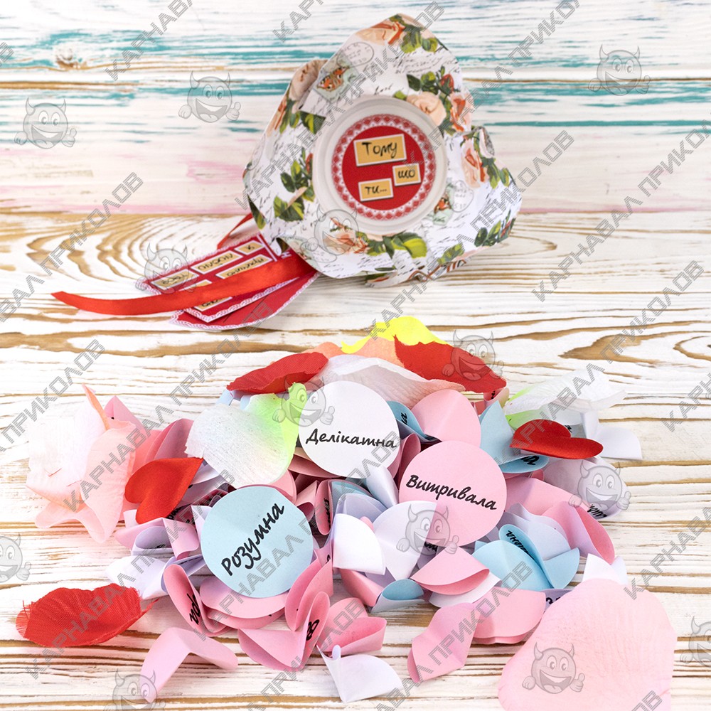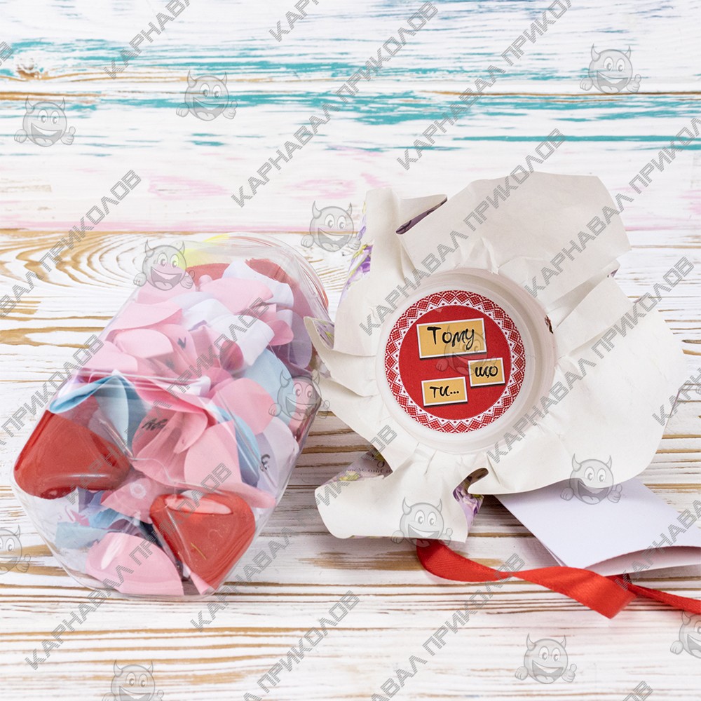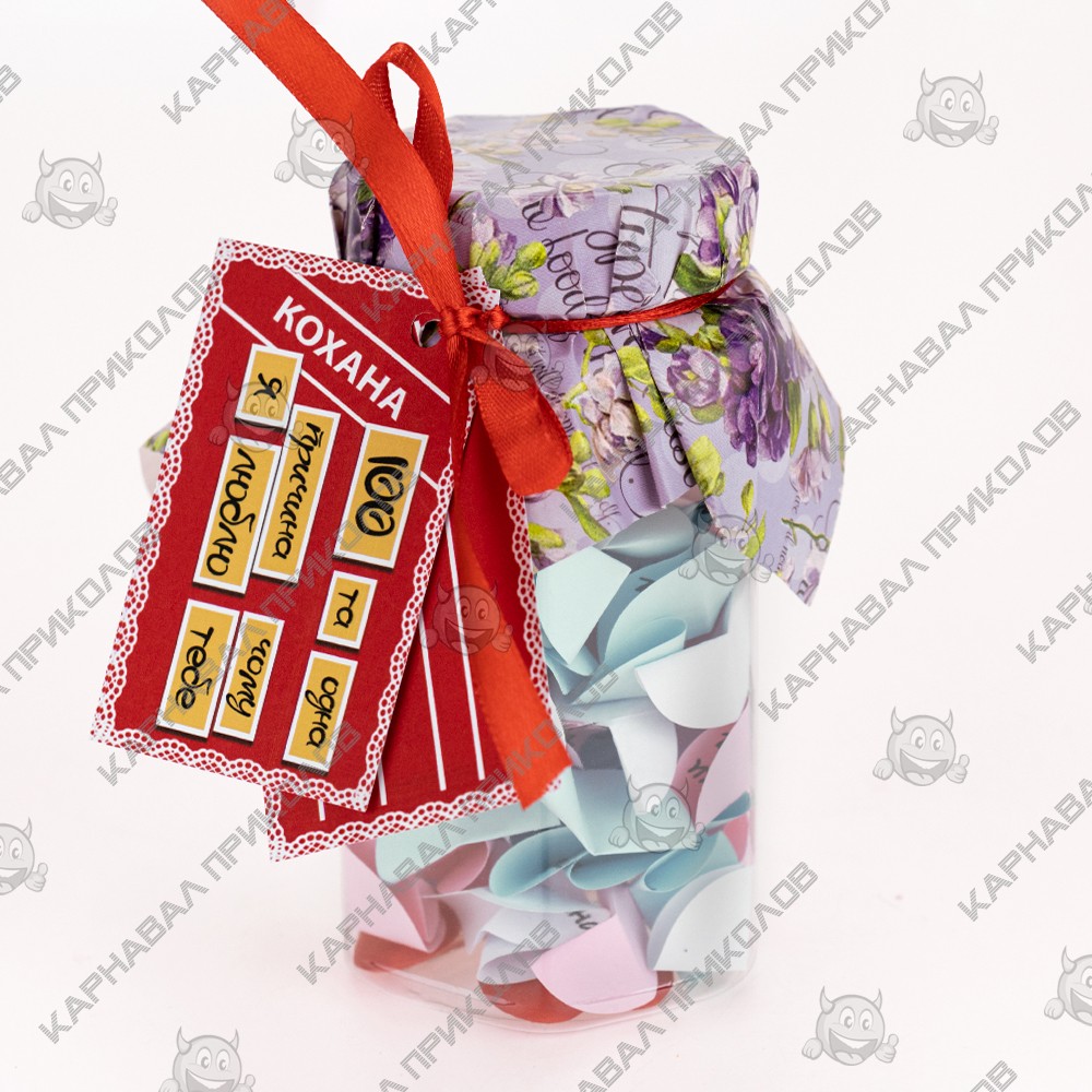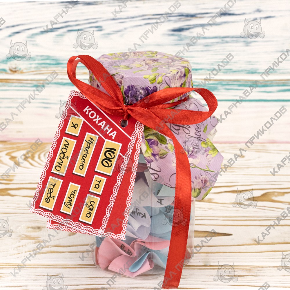 100 и Одна Причина, почему я люблю тебя Любимая (укр.) — тщательно отобран нашими специалистами по ярким эмоциям. Баночка поможет Вам ежедневно радовать близкого Вам человека теплыми словами любви. Такой изумительный сюрприз можно подарить на день рождения либо преподнести в день всех влюбленных. Разворачивая фантики, произносите Лучшая, Милая, Любимая… Разумеется. Подарок выполнен на украинском языке. Вы можете постараться сделать такую банку своими руками, но это заберет у Вас невероятно много времени. Чтобы Вы не сидели несколько часов, вырезая фантики и придумывая, что же написать, мы сделали все за вас. Вы можете купить уже готовую увлекательную игру в подарок родным и близким, друзьям и знакомым. Интернет магазин Карнавал Приколов предлагает купить оптом интересные и оригинальные подарки по низким ценам, а также Вы можете оформить заказ на сайте и задать любые интересующие вопросы менеджеру, заказав звонок на нашем сайте.