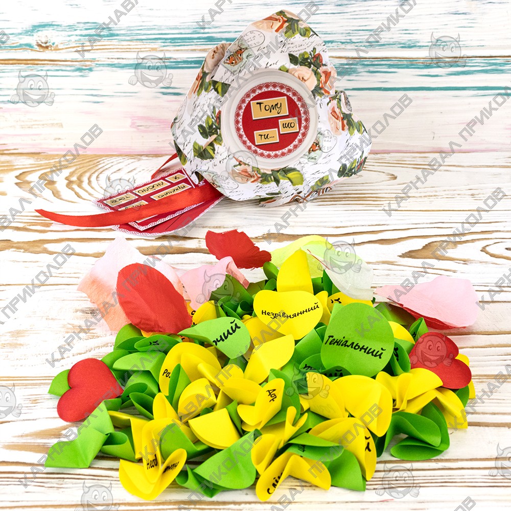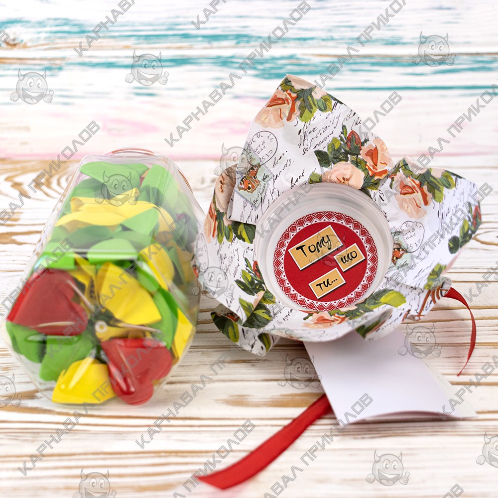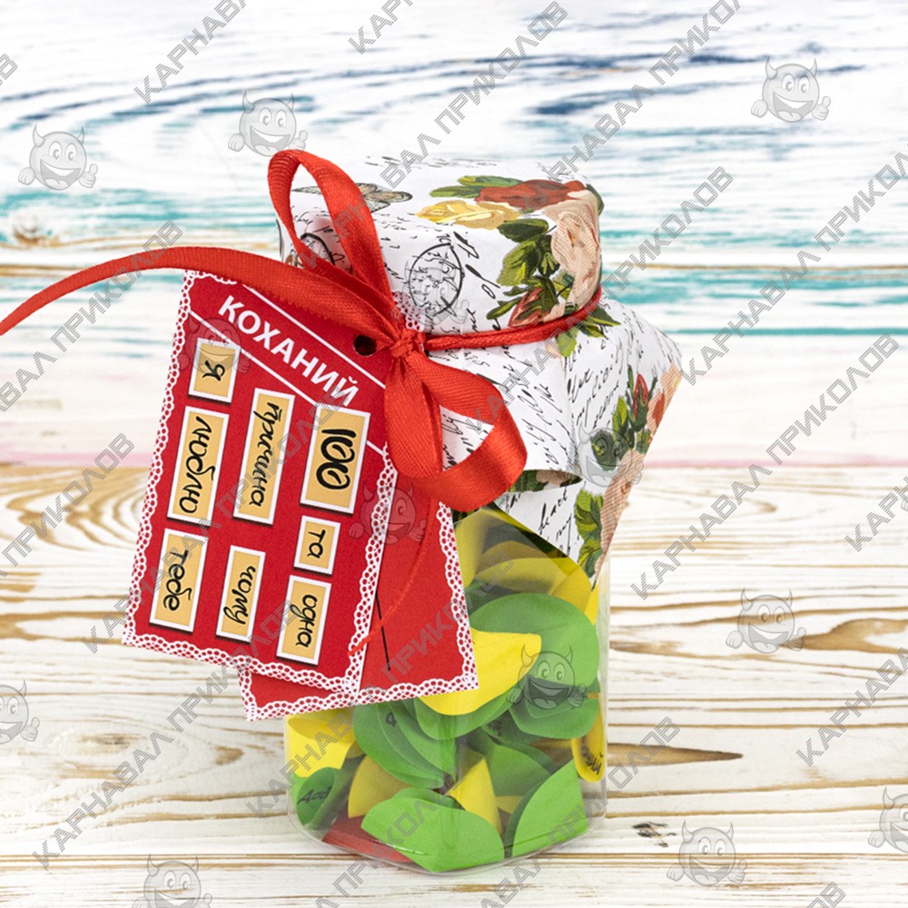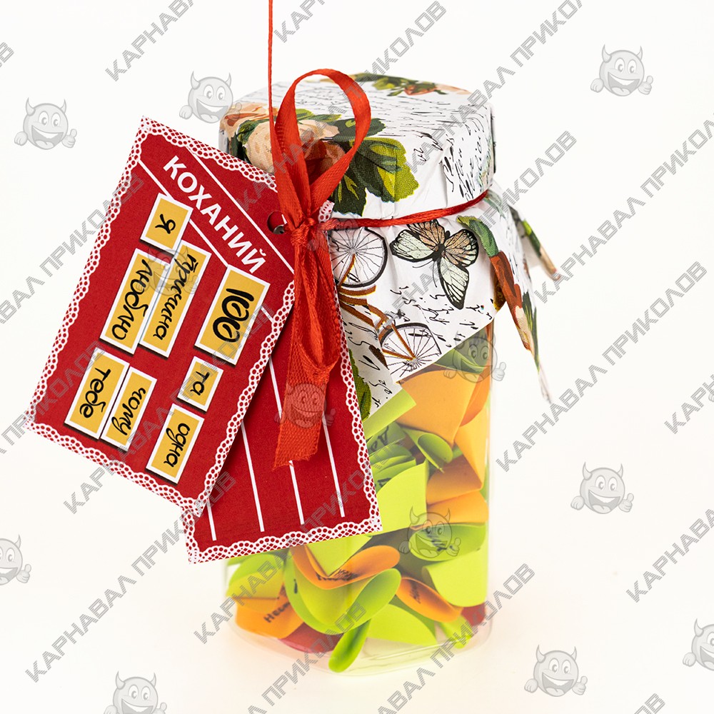 100 и Одна Причина, почему я люблю тебя, Любимый (укр.) — тщательно отобран нашими специалистами по ярким эмоциям. Баночка поможет Вам ежедневно радовать близкого Вам человека теплыми словами любви. Такой изумительный сюрприз можно подарить на день рождения либо преподнести в день всех влюбленных. Разворачивая фантики, произносите Лучший, Милый, Любимый… Разумеется, Подарок выполнен на украинском языке. Вы можете постараться сделать такую банку своими руками, но это заберет у Вас невероятно много времени. Чтобы Вы не сидели несколько часов, вырезая фантики и придумывая, что же написать, мы сделали все за вас. Вы можете купить уже готовую увлекательную игру в подарок родным и близким, друзьям и знакомым. Интернет магазин Карнавал Приколов предлагает купить оптом интересные и оригинальные подарки по низким ценам, а также Вы можете оформить заказ на сайте и задать любые интересующие вопросы менеджеру, заказав звонок на нашем сайте.