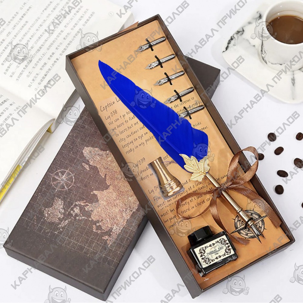 Винтажный подарочный набор для каллиграфии Ручка перьевая (синий): Искусство письма и магия старинных посланий! Окунитесь в мир изящного письма и старинных традиций с нашим Винтажным подарочным набором для каллиграфии Ручка перьевая (синий). Этот элегантный комплект станет идеальным подарком для ценителей классики, творческих личностей, а также для тех, кто ищет уникальный сувенир, вдохновленный атмосферой волшебства. С такой ручкой каждое написанное слово обретает особое очарование и вес. В центре набора — изящная перьевая ручка, выполненная из пера благородного синего цвета. Она прекрасно лежит в руке и позволяет ощутить всю прелесть письма по старинке. Ручка и элементы набора сочетают в себе винтажную эстетику и утонченность, напоминая о временах, когда письмо было настоящим искусством. Набор изготовлен из прочных материалов, включая металл для держателя ручки и натуральное перо для наконечника, а также элегантную стеклянную чернильницу. Всё это упаковано в стильную картонную коробку, которая подчеркивает подарочный статус. Винтажный подарочный набор для каллиграфии Ручка перьевая идеальный подарок для любителей каллиграфии, писателей, художников, коллекционеров или просто тех, кто ценит красивые и необычные предметы. Этот набор — не просто пишущий инструмент, это целая история. Для истинных ценителей: Позволяет практиковать искусство каллиграфии, создавать приглашения, письма и открытки с уникальным, рукописным шармом. Изысканный элемент декора: Прекрасно дополнит рабочий стол, библиотеку или кабинет, придав интерьеру нотку аристократизма. Вдохновение для творчества: Стимулирует воображение и помогает создавать настоящие шедевры. Магический сувенир для фанатов: Для всех, кто мечтает о волшебном мире Хогвартса, эта перьевая ручка станет прекрасным сувениром по тематике Гарри Поттера, позволяя почувствовать себя настоящим учеником школы чародейства и волшебства, записывающим заклинания или письма на урок. Погрузитесь в атмосферу старины и волшебства с Винтажным подарочным набором для каллиграфии Ручка перьевая (синий) от Карнавала Приколов!