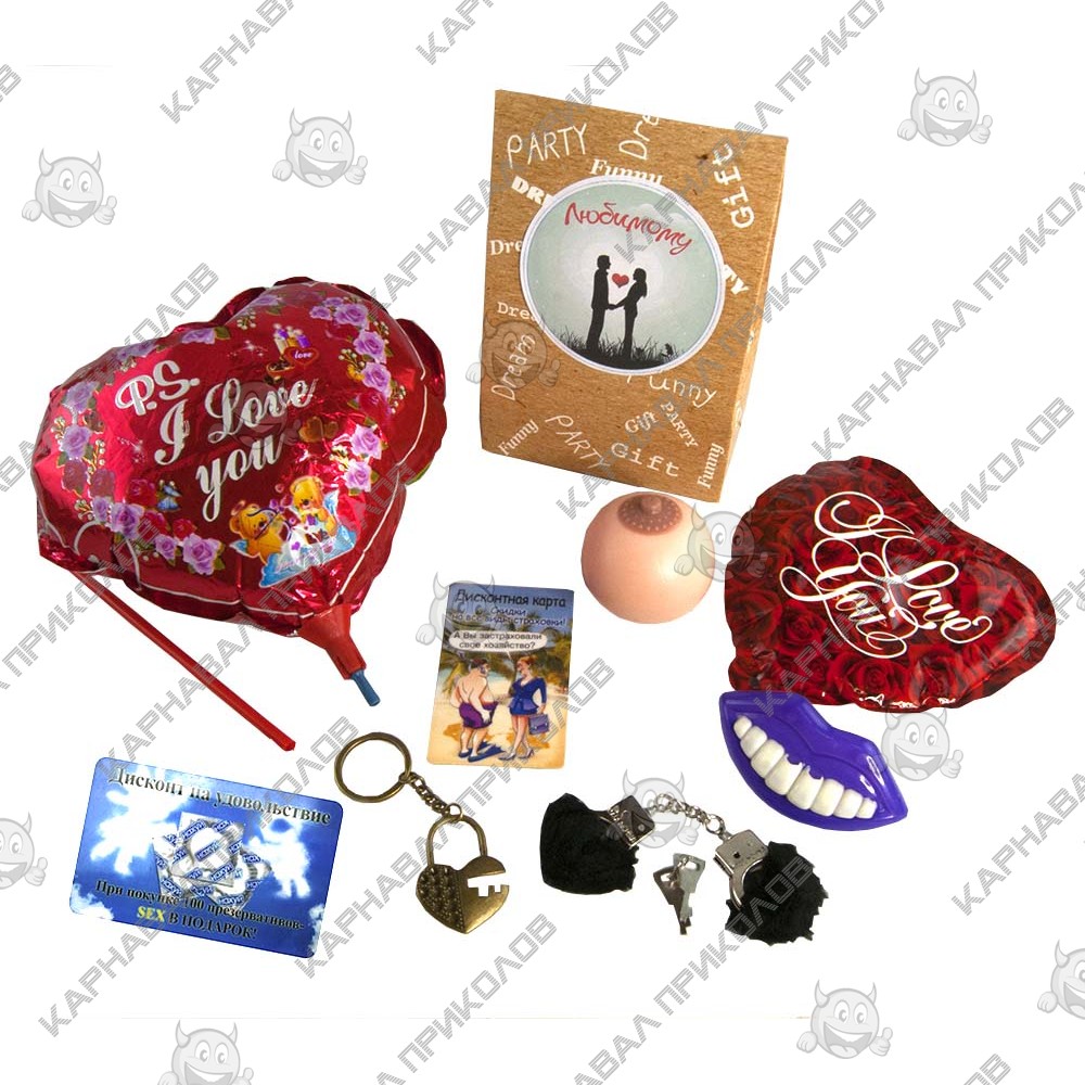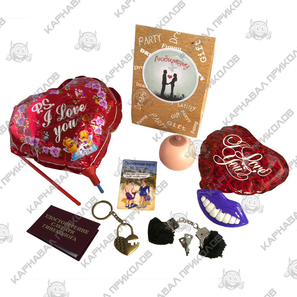 Оригинальный подарок 67101 ЛЮБИМОМУ бесподобный вариант для сюрприза возлюбленному на годовщину свадьбы или День влюбленных. Выбирая, что подарить любимому человеку, можно воплотить в реальность все самые смелые мечты. Представляем вашему вниманию нестандартный подарочный набор в котором находится пять необычных подарков, упакованных в красочную коробку. В состав входит удостоверение Любимого Мужчины и карта Скидка на все виды страховки с юмористической надписью. Эти милые безделушки гарантированно вызовут улыбку и развеселят Вашего любимого. Релаксант грудь настоящий мужской брелок! Выглядит он как натуральная женская грудь, которая уж точно понравится вашему мужчине. Также в набор входит еще один брелок сердечко, оно как ничто другое расскажет о Ваших чувствах возлюбленному. Такой брелочек будет маленьким доказательством Вашей большой любви, даже если Ваш любимый не рядом, смотря на плюшевое сердце, он будет помнить о вас. Дополнят такой забавный и нестандартный подарок меховые наручники на пальцы. Такое необычное украшение для пальцев может послужить сексуальной игрушкой для влюбленных. Ваш ненаглядный будет, несомненно, рад такому забавному сюрпризу. Веселое настроение вам гарантированно! Купить такой прикольный подарок для парня Вы можете в интернет-магазине Карнавал Приколов. В состав входит: шарик на палочке, релаксант грудь маленькая, наручники на пальцы, дисконтная карта Скидки на все виды страховки, свисток губы, брелок винтажный сердце, карта, дисконтная карта Дисконт на удовольствие