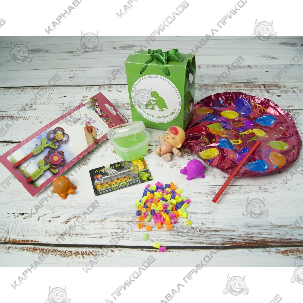 Ваша непоседа круглыми сутками залипает в Свинку Пэппу и ей больше ничего не любопытно? Займите ее лучше чем-то более полезным, и интернет-магазин Карнавал Приколов готов помочь Вам с этим. Плодотворней всего проводить время с какой-то полезной вещицей. Например, оригинальный подарок Маленькая рукодельница будет очень интересным и увлекательным для ребенка. Такой детский набор состоит из Красочной коробки с интересными подарками, которые покорят любого сынишку. Купив Подарок детский 67 11 Маленькая рукодельница в нашем интернет-магазине Вы получаете не только качественный товар, а и 100% позитивных впечатлений от приобретения. Среди нашего широкого ассортимента товаров, Вы найдете множество необычных и оригинальных подарков для различных мероприятий. В набор входит: Креативный набор для плетения – 1шт., Лизун Слайм светонакопительный средний – 1шт., Декор для наушников – 1шт., Растущая Черепаха – 2шт., Брелок брызгалка Пупс – 1шт., Прикольная Кредитка Лимон Банк – 1шт., Шарик с палочкой (2 см) Happy Birthday – 1шт. Цвет комплектующих может отличаться от цвета указанного на фотографии.