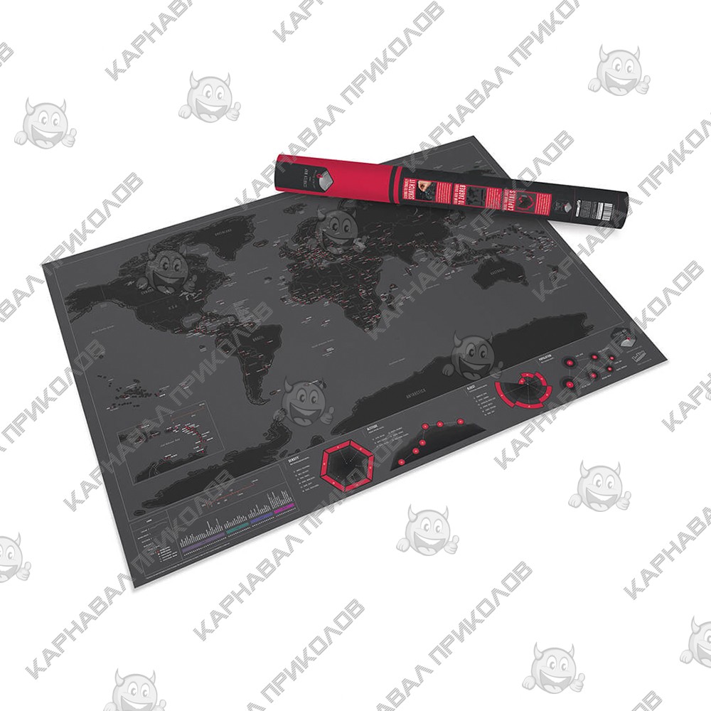 Что может быть лучше, чем путешествовать и узнавать что-нибудь новое? Конечно, можно делать различные фото и снимать видео. Но, можно быть более оригинальным и запечатлеть приятные момент совсем по-другому. Вот, например, если Вы зайдете к нам в интернет-магазин Карнавал Приколов и присмотритесь к скретч карте мира Черное Издание. Это удивительная и совершенно новая карта имеет стильное сочетание цветов черного и красного. Для того, чтобы ей пользоваться, Вам всего лишь надо стирать на ней те места, в которых Вы побывали монеткой. Карта срразу приобретет цветной вид, и очень красочный к тому же еще и яркие цвета стран на черном фоне смотрятся очень эфектно. Недавно вернулись из Греции? Пометьте это на Вашей скретч карте, и Вы точно не забудете эту поездку. Ведь каждому хочется запомнить свои путешествия, а поможем Вам в этом очень креативный подарок. Вы можете брать эту скретч карту с собой. И она будет всегда находиться с Вами, чтобы Вы не забывали отмечать и разглядывать все места в которых бывали или хотели бы побывать.