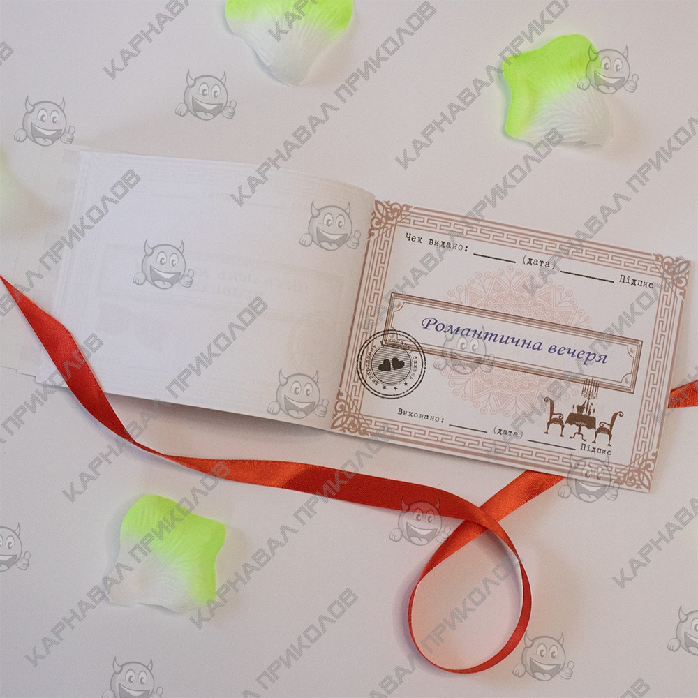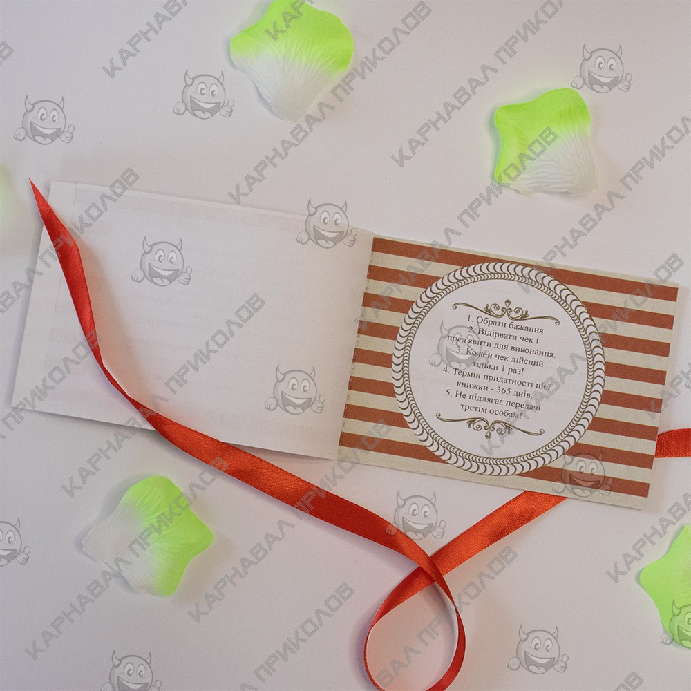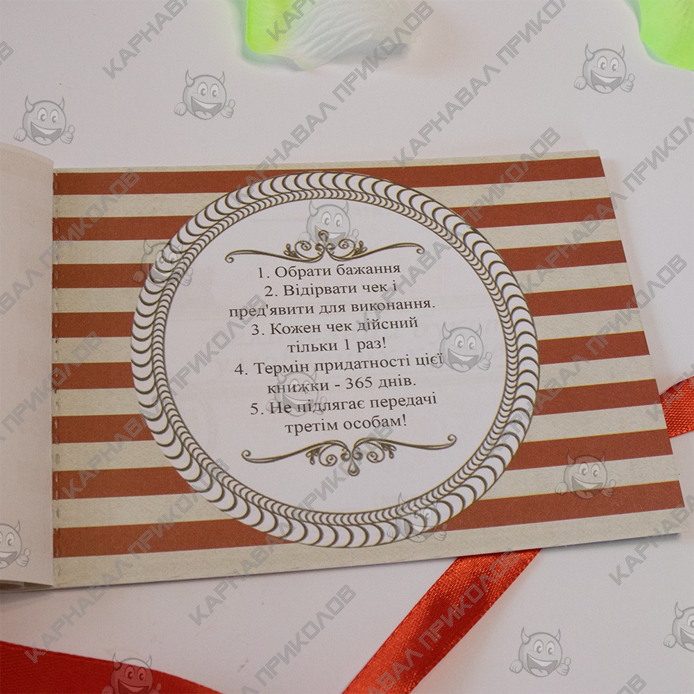 Чековая Книжка Желаний – самый дорогой подарок, так как Вы дарите самые бесценные вещи Любовь и Внимание. Это прекрасный и незабываемый подарок на любой праздник для Вашей половинки. С подарком Чековая книжка желаний ДЛЯ НЕЇ (укр.) вы обязуетесь выполнить 15 простых, но в тоже время очень приятных квестов или желаний вашей девушки в установленный период. Книжка состоит из 16 страниц, странички с подробной инструкцией по использованию и 15 дизайнерских купонов с желаниями все на русском языке. Например - получасовой массаж, любое желание, приятный сюрприз и многие другие. Ваша любимая выбирает купон с желанием, а Вы должны его выполнить. В дополнение чековой книжке Вы можете приобрести сладкий сюприз и оригинальный подарок 100 и Одна Причина в нашем интернет магазине Карнавал Приколов. Купив Чековая книжка желаний ДЛЯ НЕЇ (укр.) вы получаете не только качественный товар, а и 100% позитивных впечатлений от приобретения.