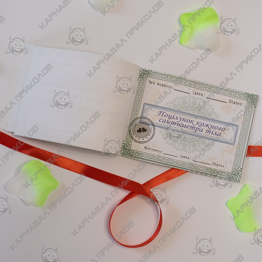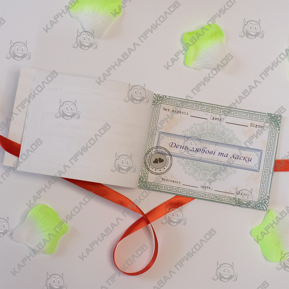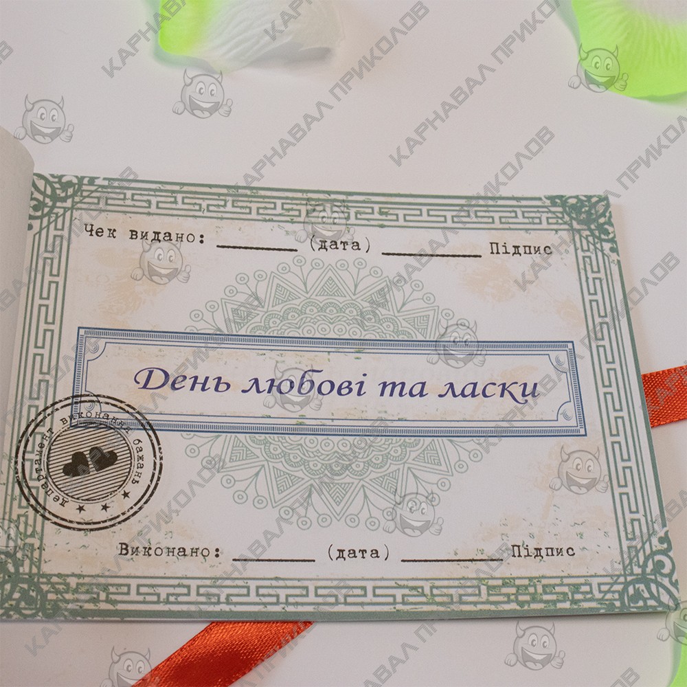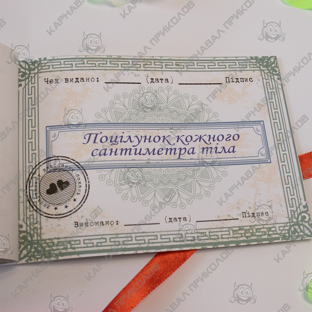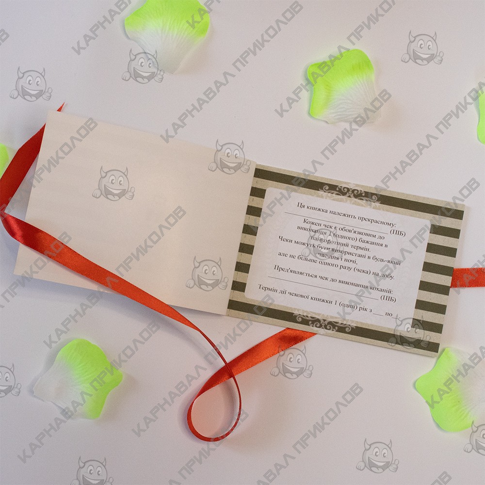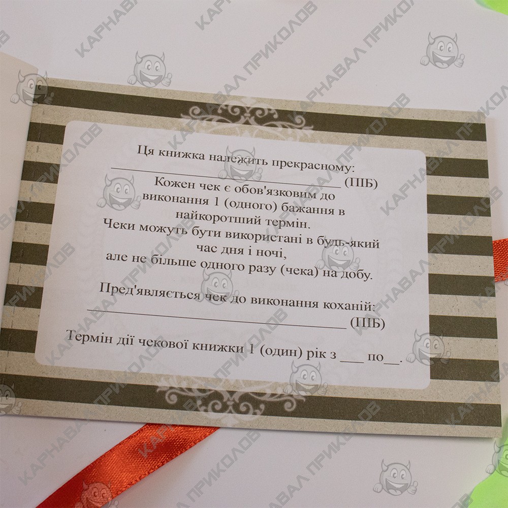 Чековая Книжка Желаний – самый дорогой подарок, так как Вы дарите самые бесценные вещи Любовь и Внимание. Это прекрасный и незабываемый подарок на любой праздник для Вашей половинки. С подарком Чековая книжка желаний ДЛЯ НЬОГО (укр.) Вы обязуетесь выполнить 15 простых, но в тоже время очень приятных квестов или желаний вашего парня в установленный период. Книжка состоит из 16 страниц, странички с подробной инструкцией по использованию и 15 дизайнерских купонов с желаниями все на русском языке. Например – кофе в постель, поцелуй каждого сантиметра тела, эротический массаж и многие другие. Ваш любимый выбирает купон с желанием, а Вы должны его выполнить. В дополнение чековой книжке Вы можете приобрести сладкий сюприз и оригинальный подарок 100 и Одна Причина в нашем интернет магазине Карнавал Приколов. Чековая книжка желаний ДЛЯ НЬОГО (укр.) вы получаете не только качественный товар, а и 100% позитивных впечатлений от приобретения.