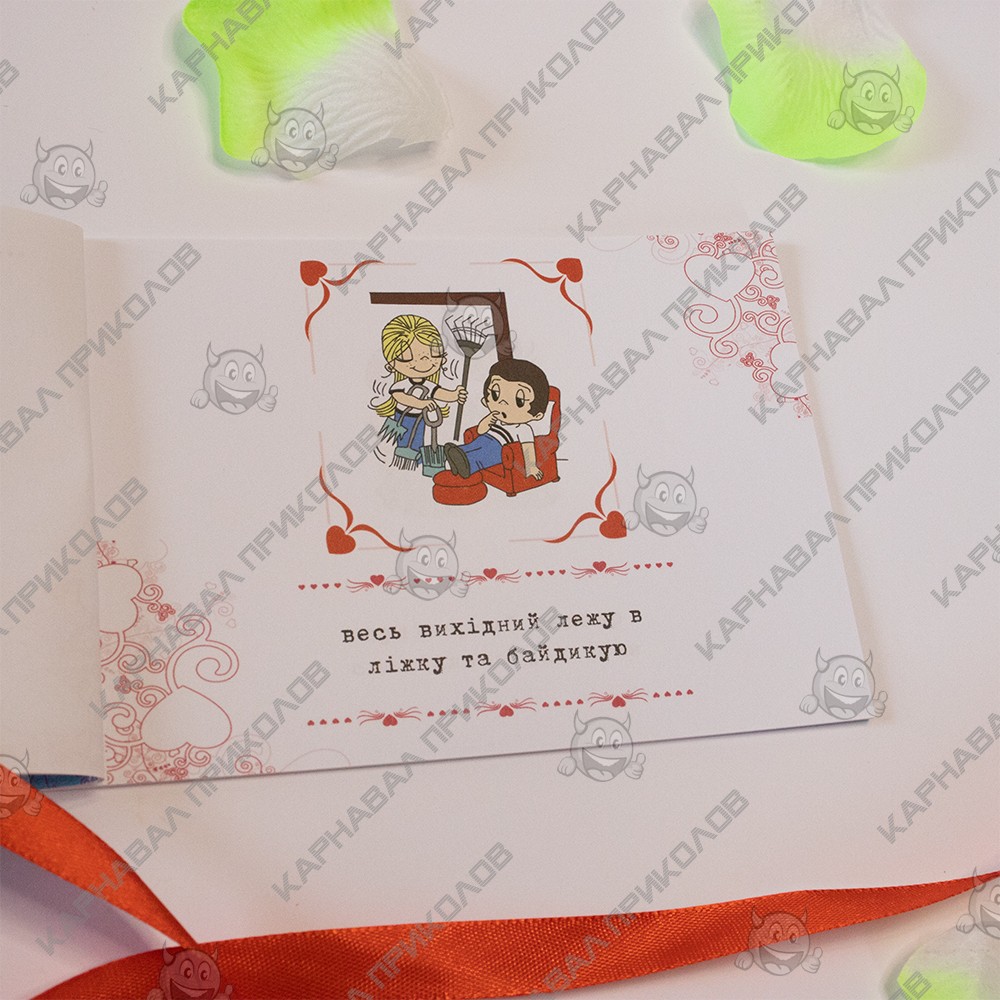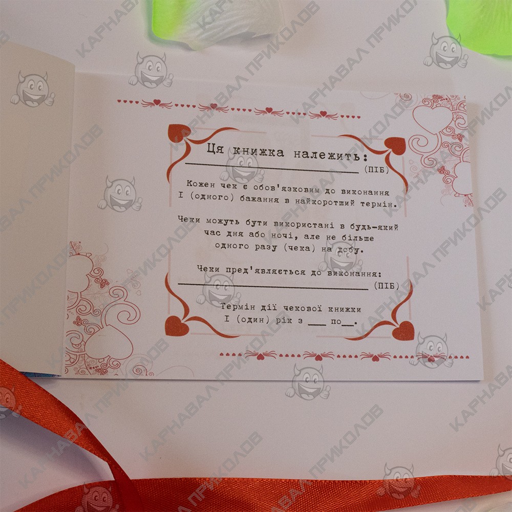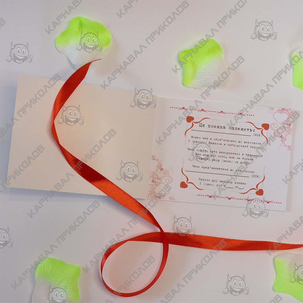 Чековая Книжка Желаний – самый дорогой подарок, так как Вы дарите самые бесценные вещи Любовь и Внимание. Это прекрасный и незабываемый подарок на любой праздник для Вашей половинки. С подарком Чековая книжка Love is Вы внесете разнообразие, выполнив 15 простых, но в тоже время очень приятных квестов или желаний вместе с вашей половинкой в установленный период. Книжка состоит из 16 страниц, странички с подробной инструкцией по использованию и 15 дизайнерских купонов с желаниями все на русском языке. Например – ужин на крыше, встретить рассвет в необычном месте, пикник в парке и многие другие. Вы с любимым человеком выбираете купон с желанием и вместе его выполняете. В дополнение чековой книжке Вы можете приобрести сладкий сюприз и оригинальный подарок 100 и Одна Причина в нашем интернет магазине Карнавал Приколов. Купив Чековая книжка Love is вы получаете не только качественный товар, а и 100% позитивных впечатлений от приобретения.