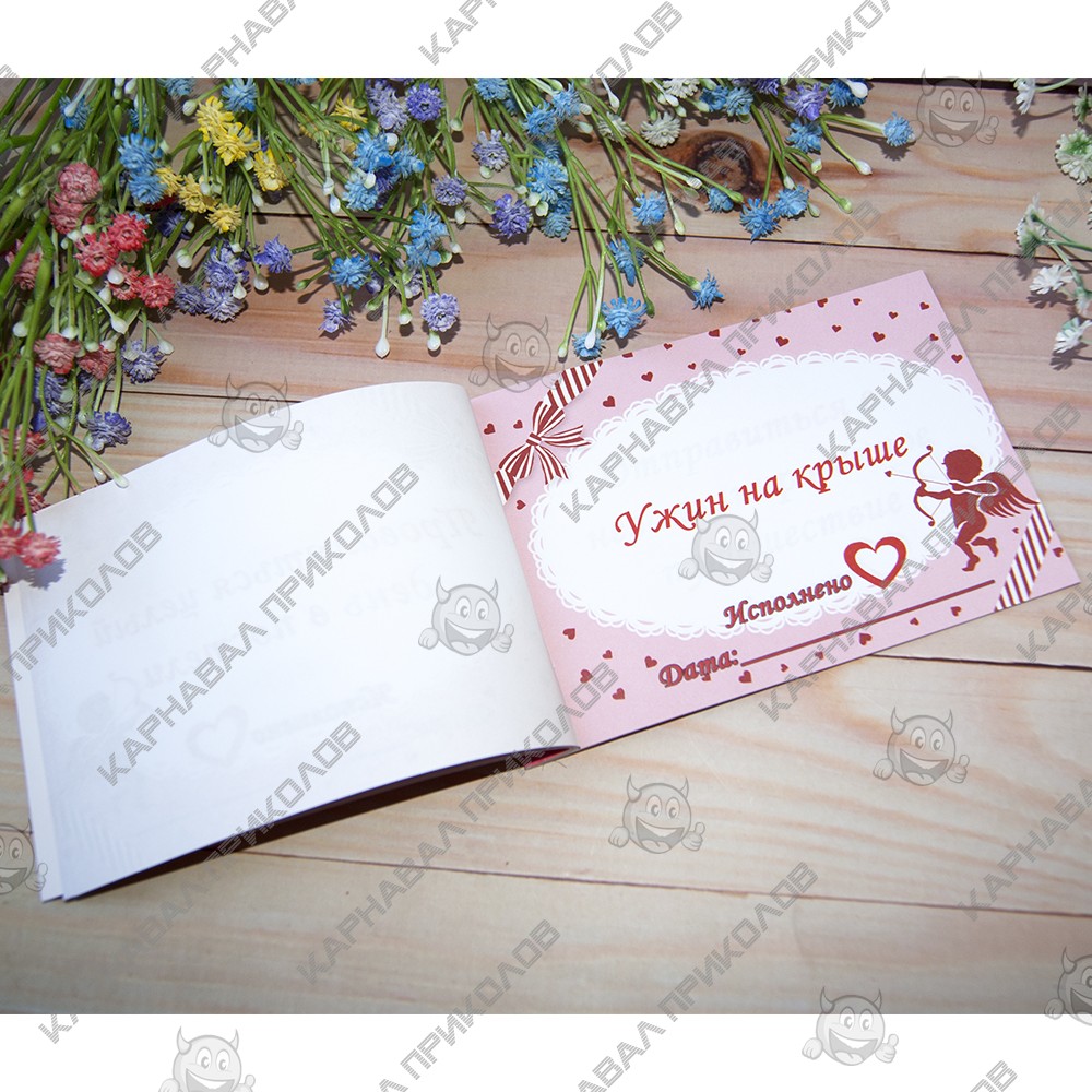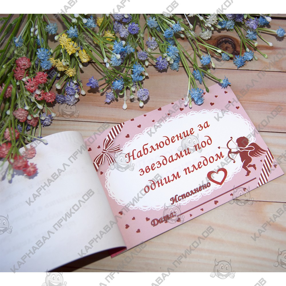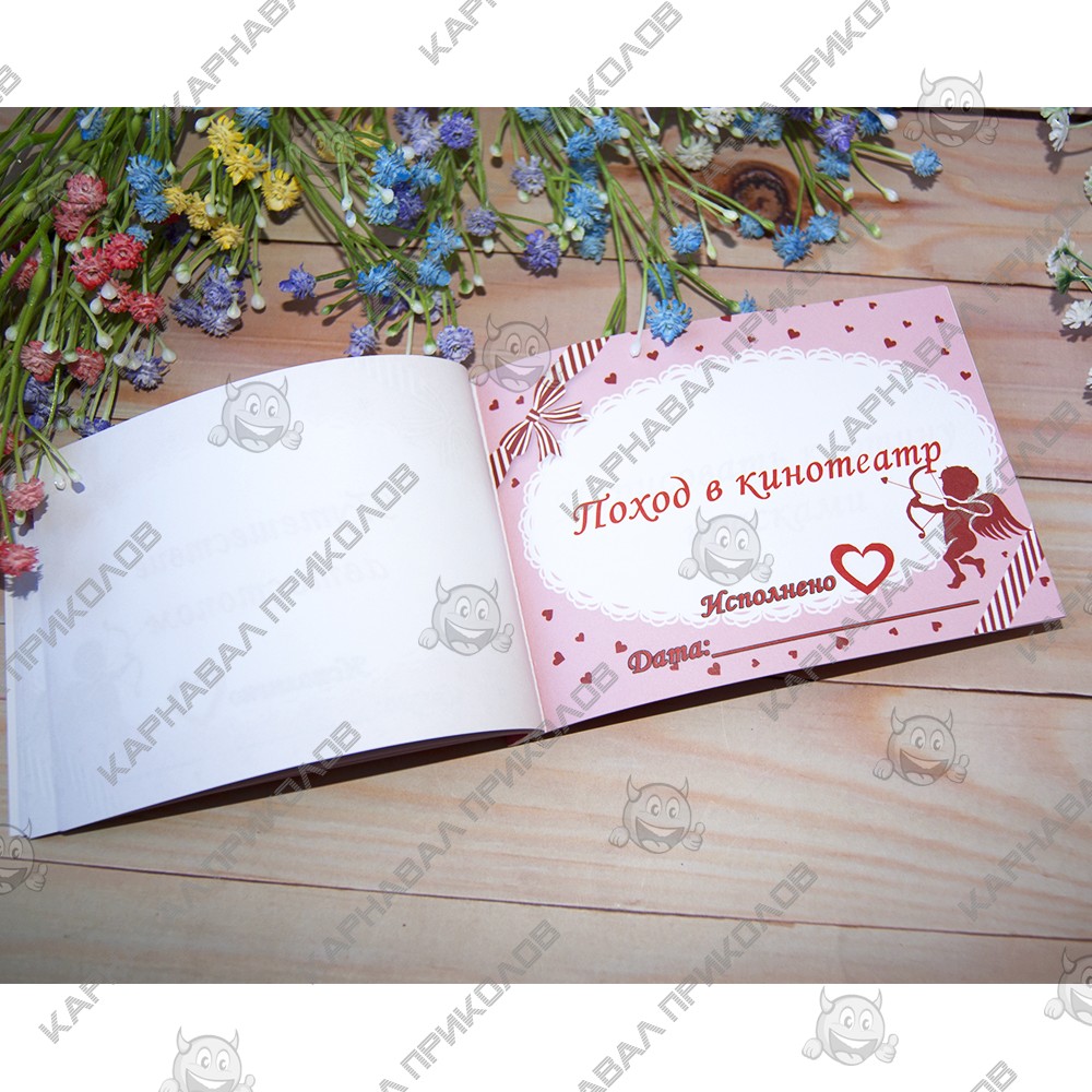 Чековая Книжка Желаний – самый дорогой подарок, так как Вы дарите самые бесценные вещи Любовь и Внимание. Это прекрасный и незабываемый подарок на любой праздник для Вашей половинки. С подарком Чековая книжка Love Story Вы внесете разнообразие, выполнив 15 простых, но в тоже время очень приятных квестов или желаний вместе с вашей половинкой в установленный период. Книжка состоит из 16 страниц, странички с подробной инструкцией по использованию и 15 дизайнерских купонов с желаниями все на русском языке. Например – ужин на крыше, встретить рассвет в необычном месте, пикник в парке и многие другие. Вы с любимым человеком выбираете купон с желанием и вместе его выполняете. В дополнение чековой книжке. Вы можете приобрести сладкий сюприз и оригинальный подарок 100 и Одна Причина в нашем интернет магазине Карнавал Приколов. Купив Чековая книжка Love Story вы получаете не только качественный товар, а и 100% позитивных впечатлений от приобретения.