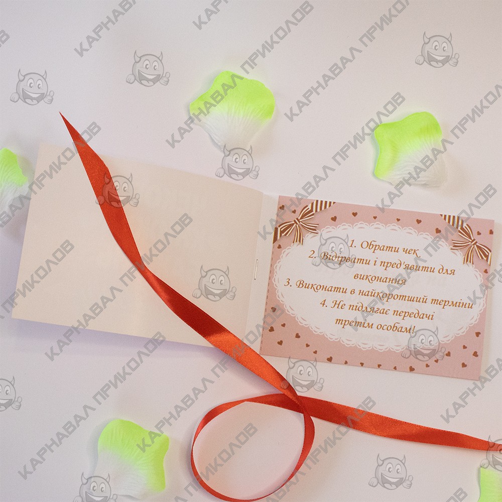 Чековая книжка желаний LOVE STORY (укр.) – самый дорогой подарок, так как Вы дарите самые бесценные вещи Любовь и Внимание. Это прекрасный и незабываемый подарок на любой праздник для Вашей половинки. С подарком Чековая книжка желаний LOVE STORY (укр.) Вы внесете разнообразие, выполнив 15 простых, но в тоже время очень приятных квестов или желаний вместе с вашей половинкой в установленный период. Книжка состоит из 16 страниц, странички с подробной инструкцией по использованию и 15 дизайнерских купонов с желаниями все на русском языке. Например – ужин на крыше, встретить рассвет в необычном месте, пикник в парке и многие другие. Вы с любимым человеком выбираете купон с желанием и вместе его выполняете. В дополнение чековой книжке. Вы можете приобрести сладкий сюприз и оригинальный подарок 100 и Одна Причина в нашем интернет магазине Карнавал Приколов. Купив Чековая книжка желаний LOVE STORY (укр.) вы получаете не только качественный товар, а и 100% позитивных впечатлений от приобретения.